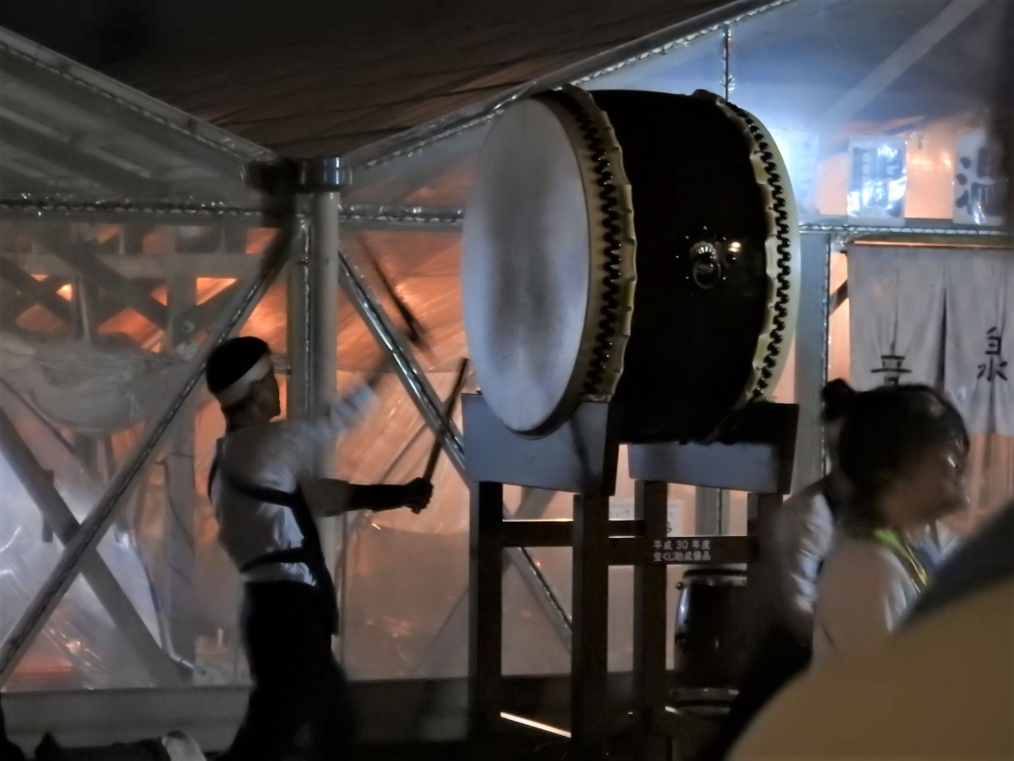 Angefeuerten wurden die mit Ruß bedecken Seilzieher(innen) auch vom Takt der Taiko-Trommeln. Wenn man nicht aufpasst, bekommt man ebenfalls das Gesicht mit Ruß beschmiert. Manche Schaulustige machen auch ganz spontan mit.