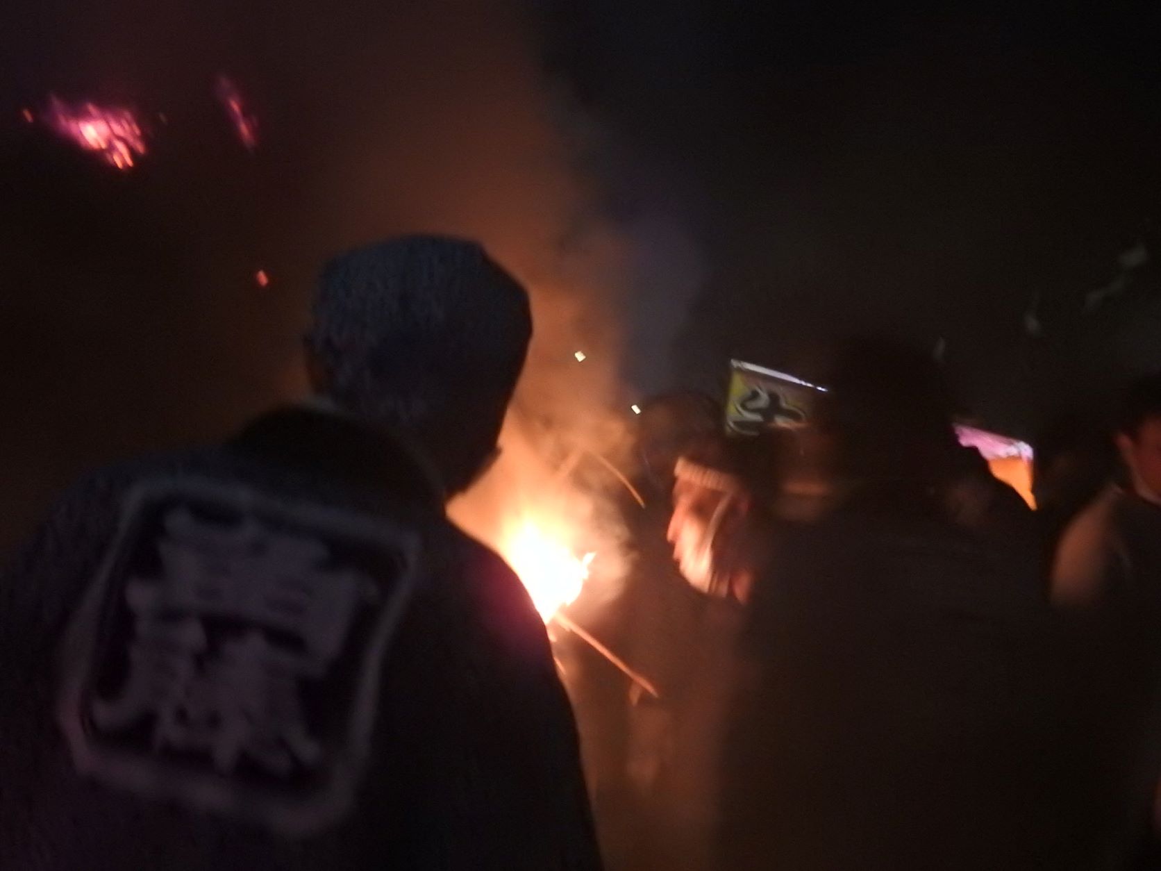 Ab und an fallen brennende Strohballen auf die Straße, aber zum Glück ist die Feuerwehr die ganze Zeit in Bereitschaft.