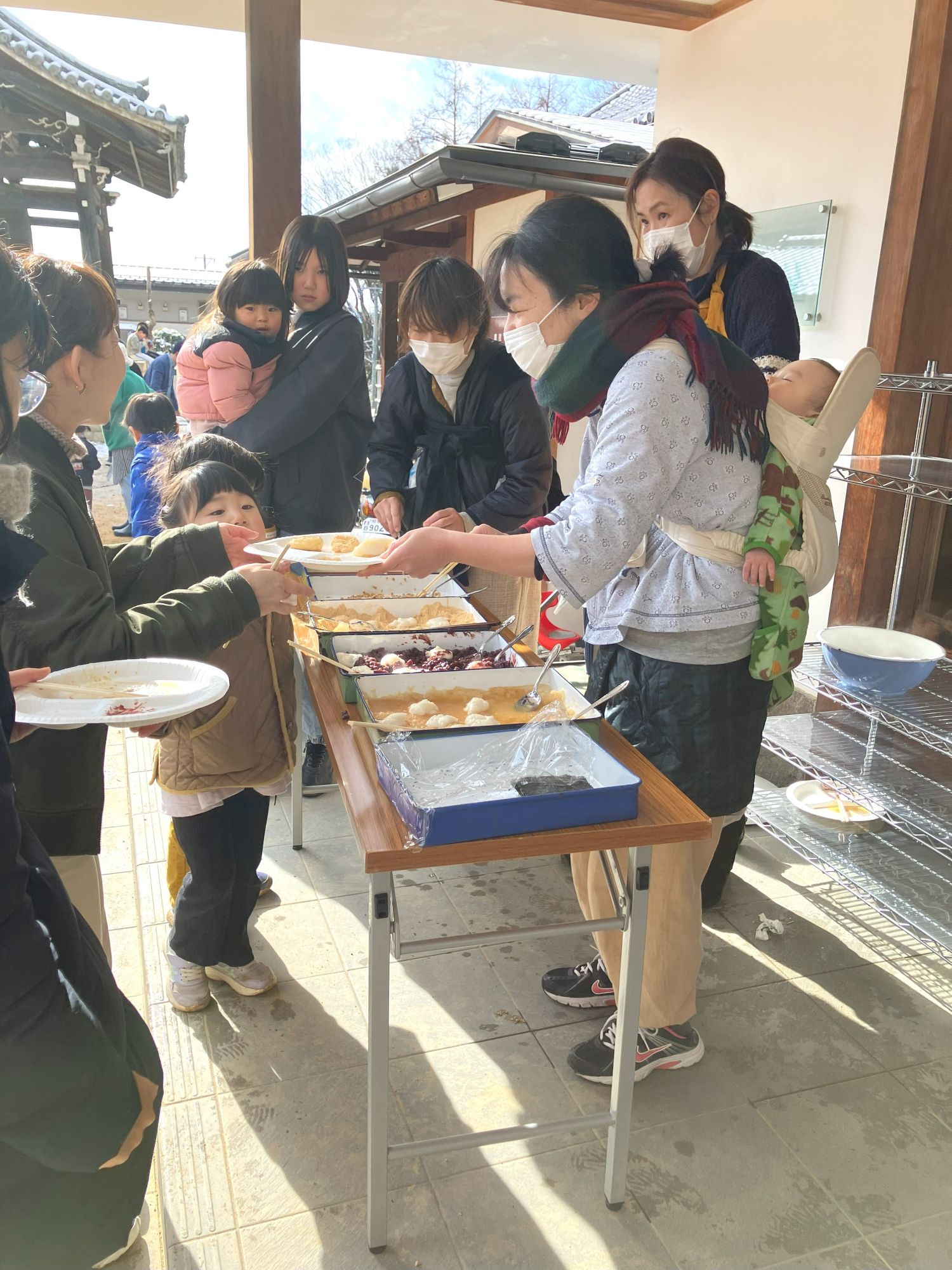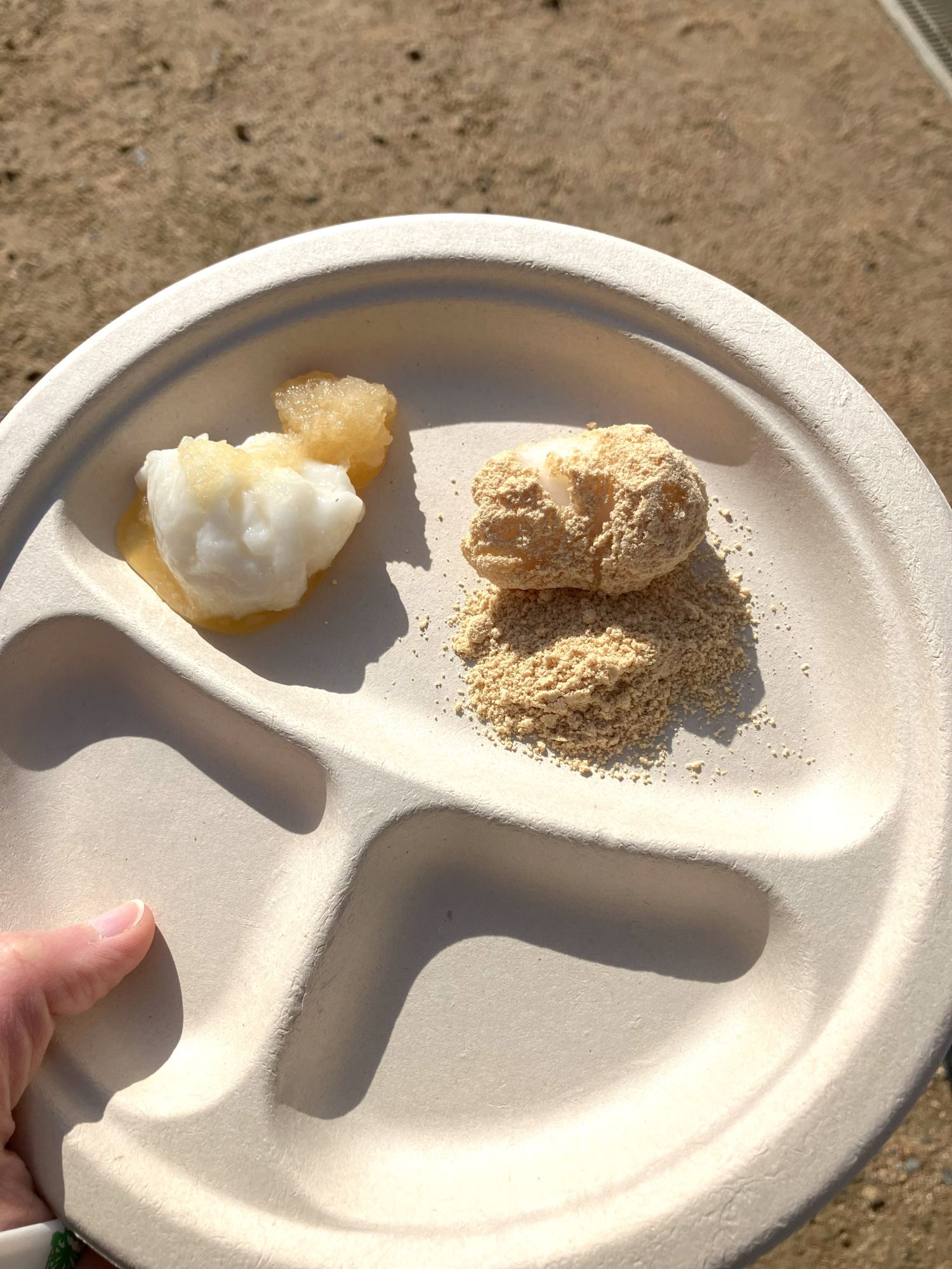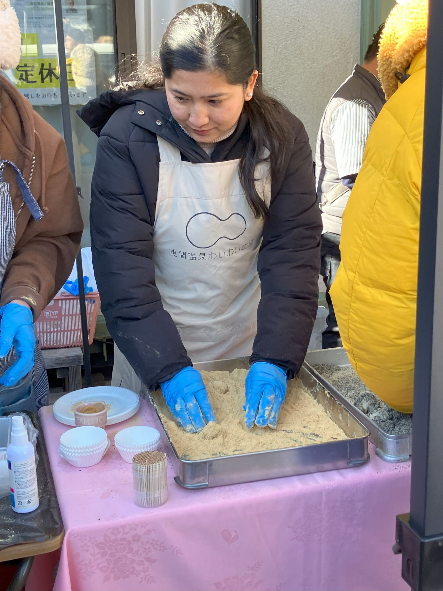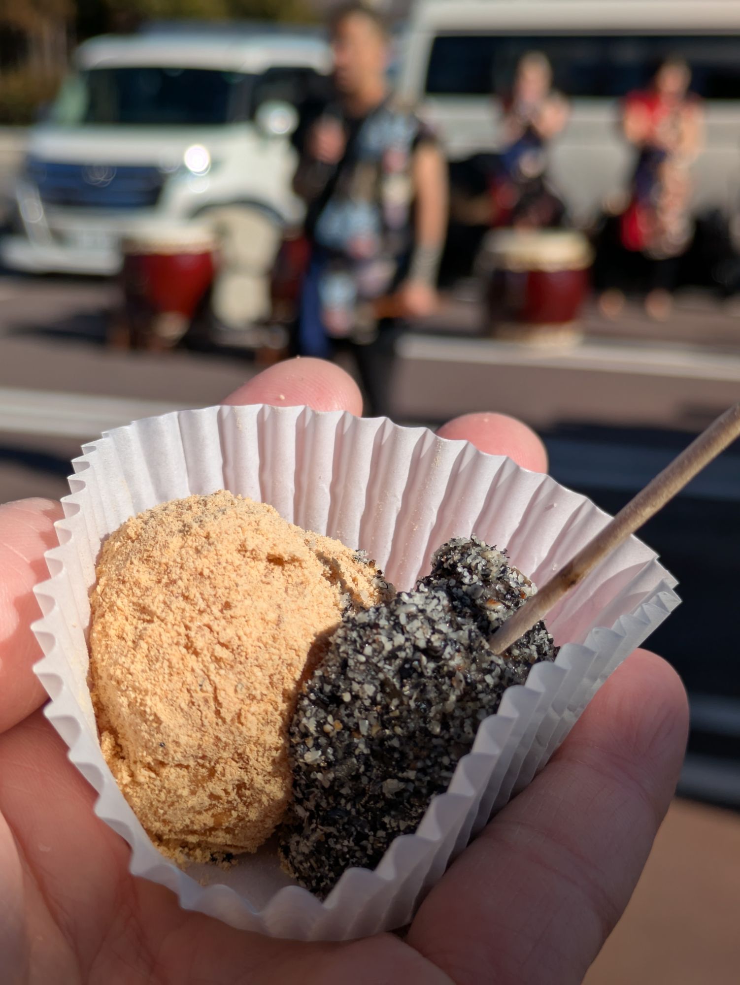 Der Höhepunkt beim Reiskuchenmachen ist für die meisten Besuchern allerdings das große Reiskuchenverschmausen. Schließlich will jeder wissen, ob der Reiskuchen gut gelungen ist. Im Eiltempo formen die fleißigen Helfer kleine Reiskuchen und servieren diese mit roten Bohnen oder geriebenem Rettich, oder sie werden in Kinako-Zucker oder schwarzen Sesam getunkt.