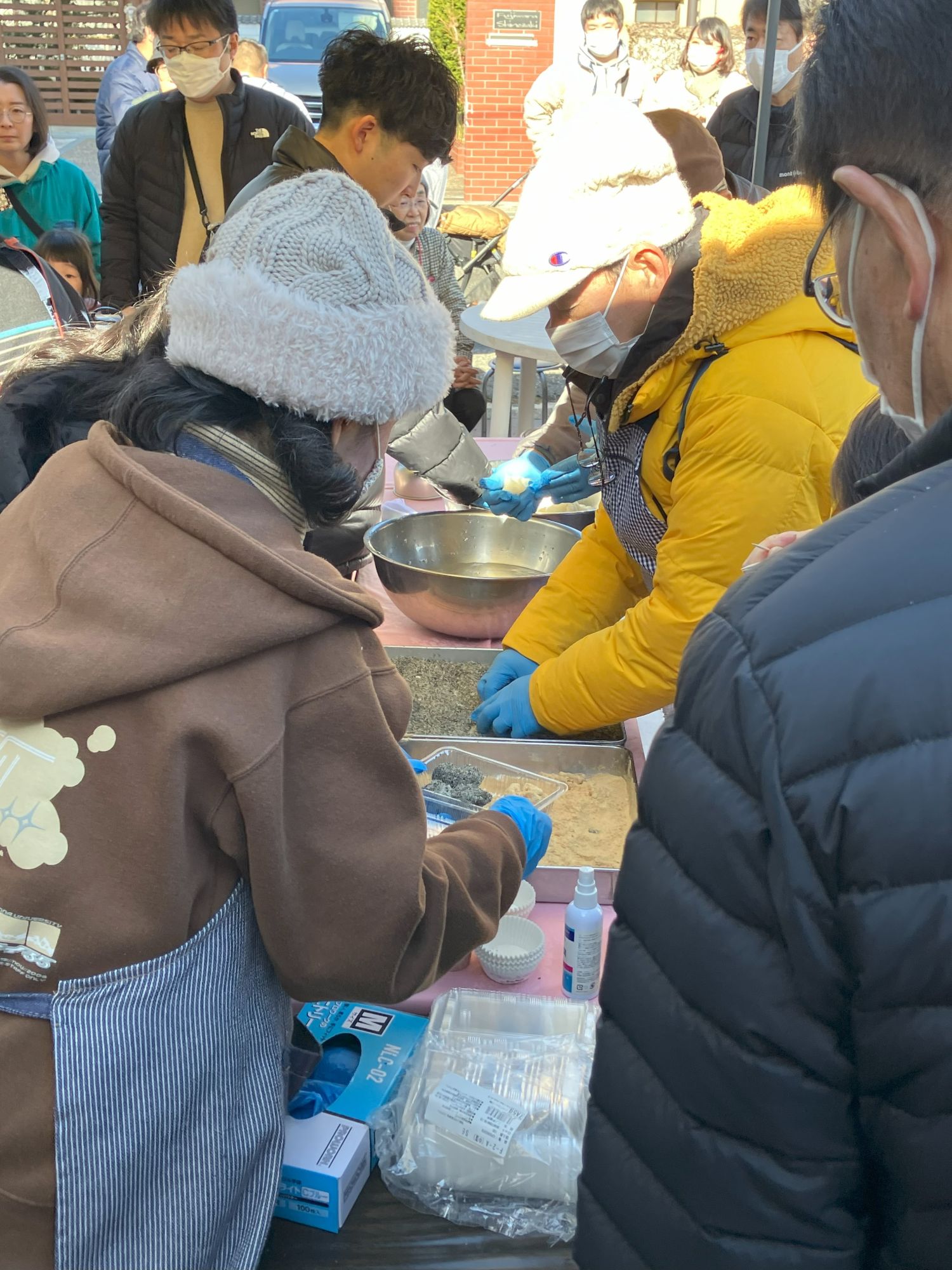 Im Handumdrehen bildet sich eine lange Schlange und im Handumdrehen sind die Reiskuchen aufgegessen, wobei sich die Zahl der schwindenden Reiskuchen in der Zahl der Besucher widerspiegelt.