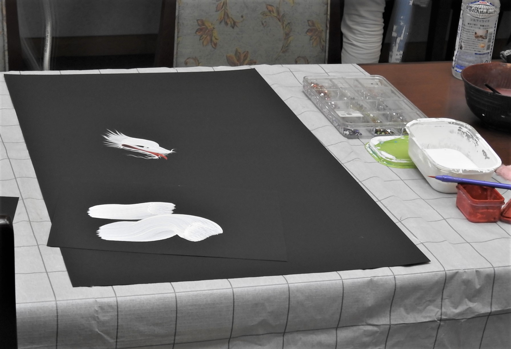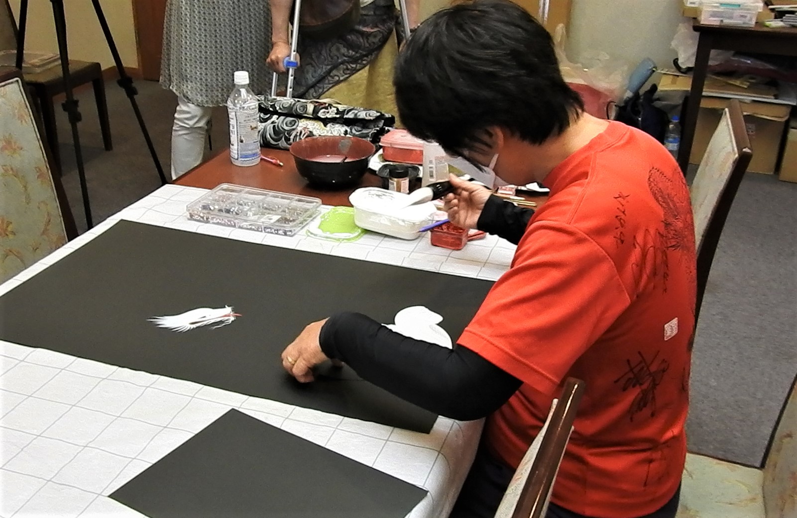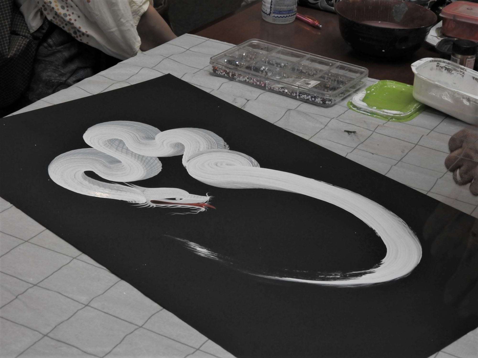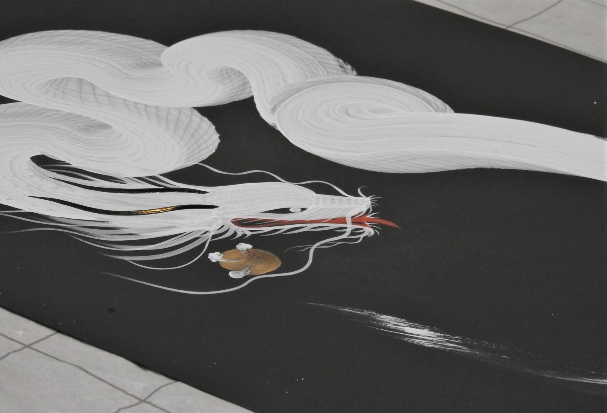 Ich hatte das Glück, die Künstlerin in Aktion zu sehen. Das Drachenbild wurde vom Gogoku-Schrein in Auftrag gegeben und soll dort ausgestellt werden.