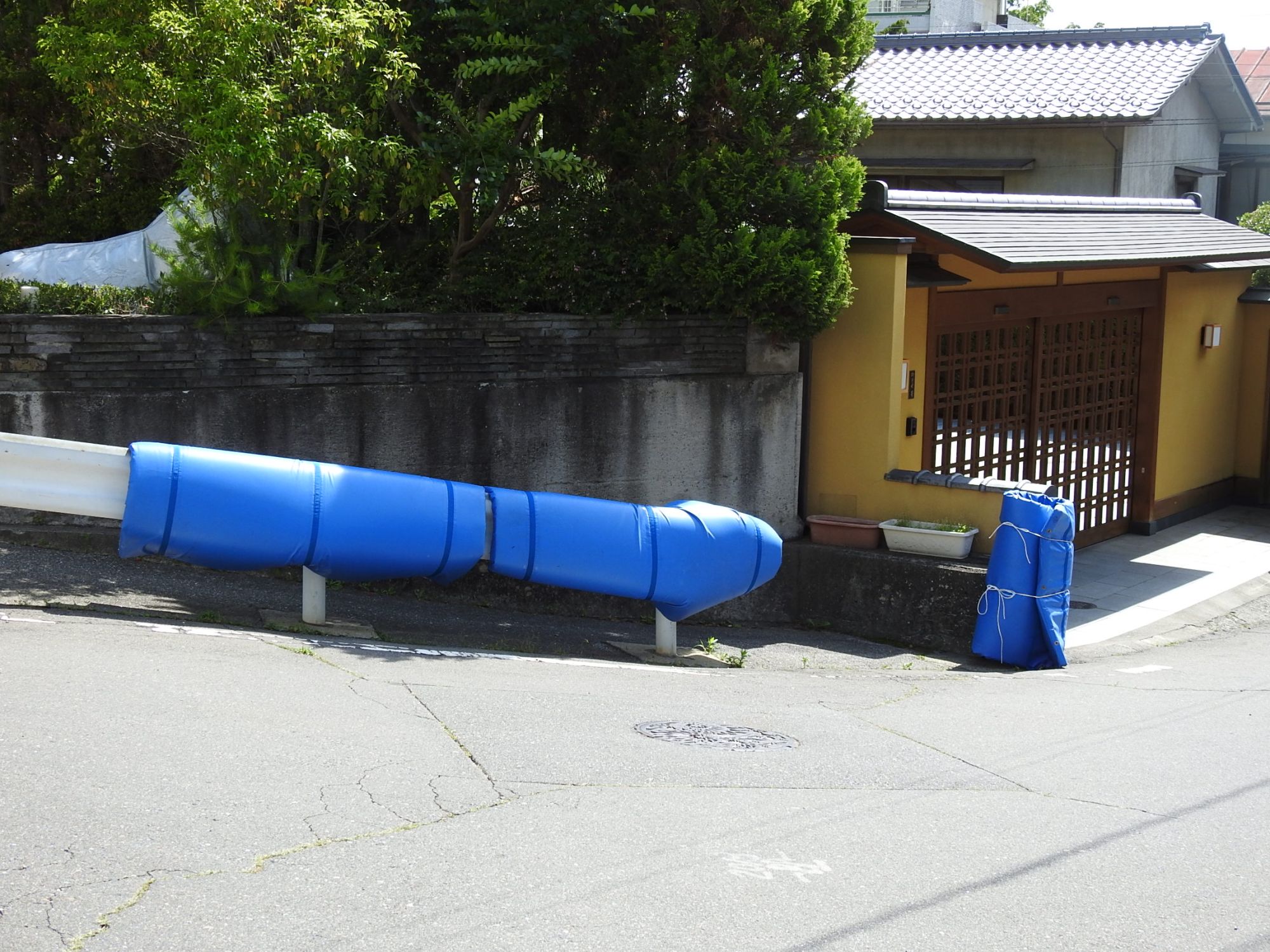 Bereits am Vortag wurde blauer Schaumstoff an Pfeilern und Leitplanken angebracht, um Verletzungen zu vermeiden – früher wurden wohl alte Futons verwendet, was sicherlich auch nett anzuschauen war.