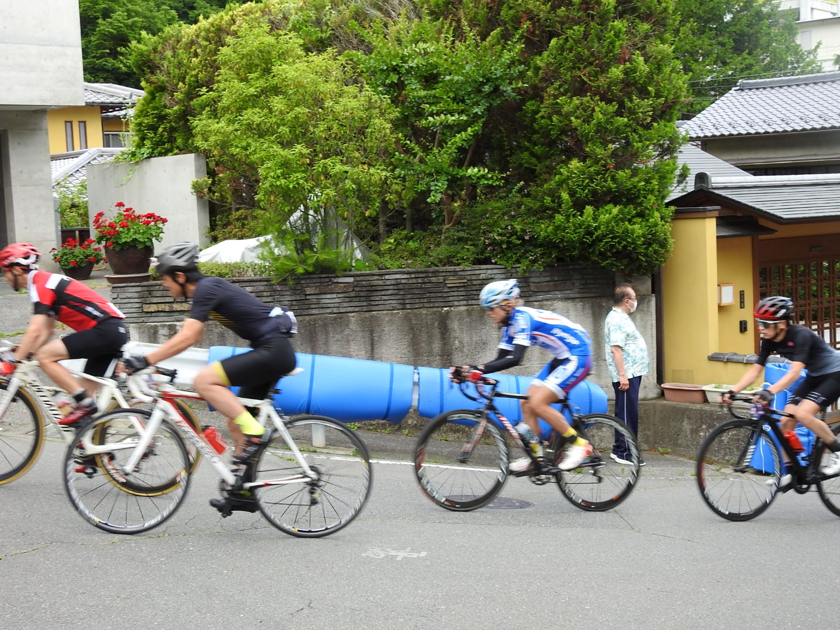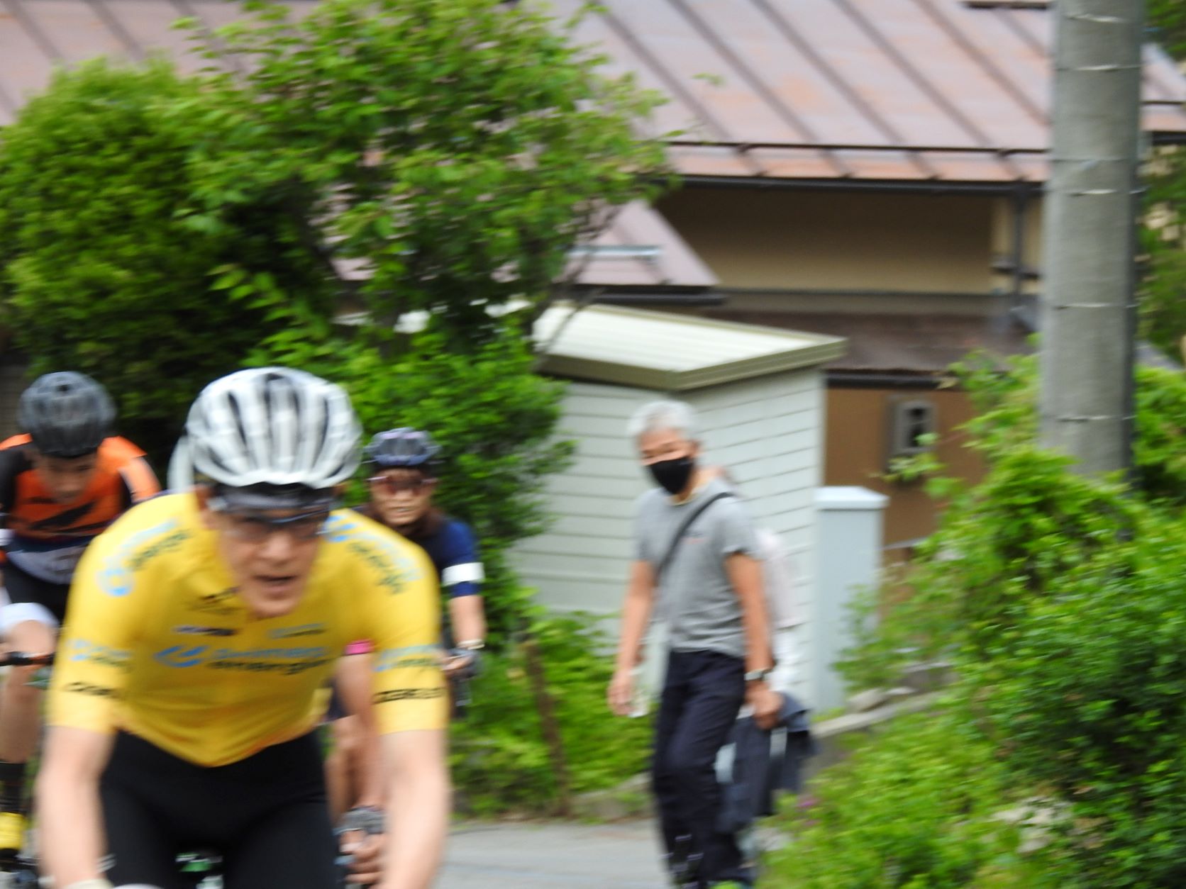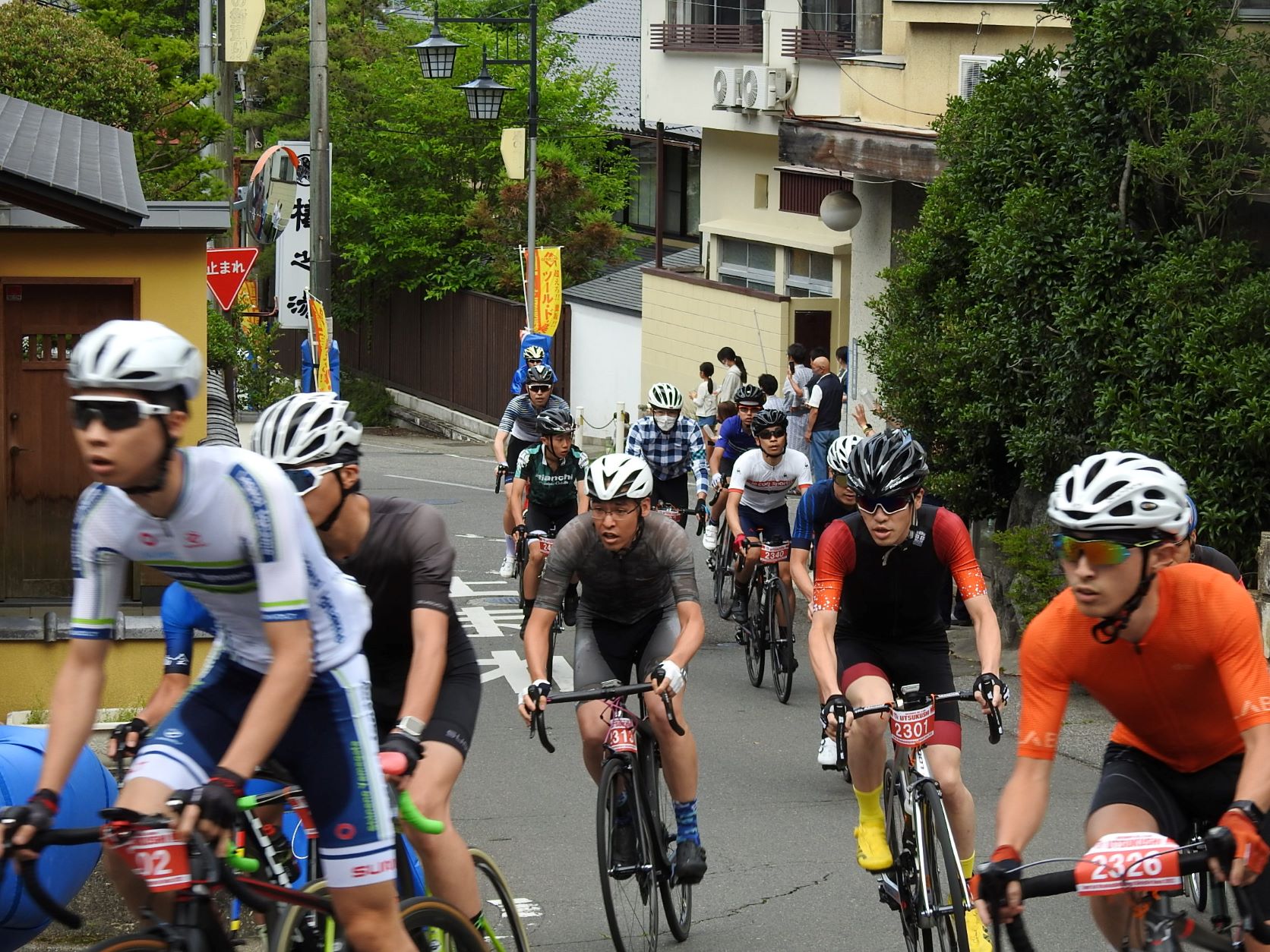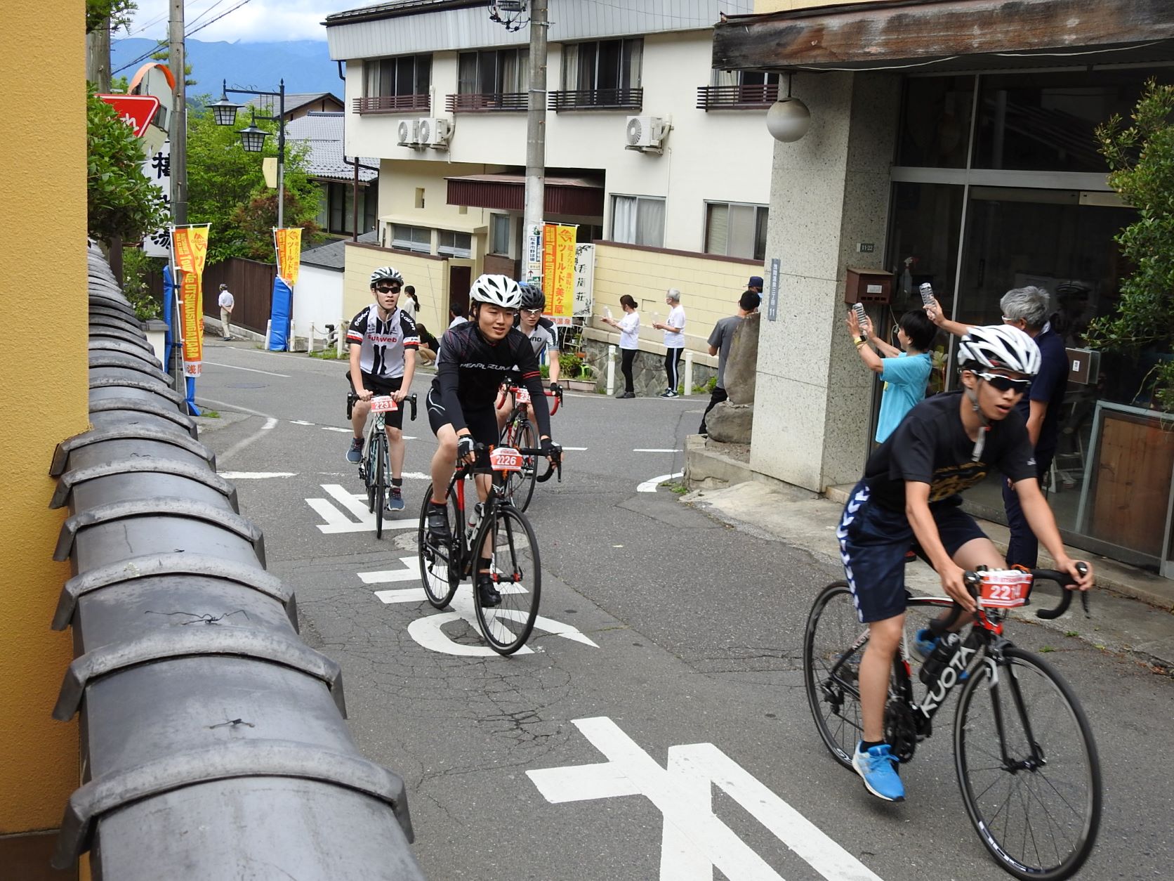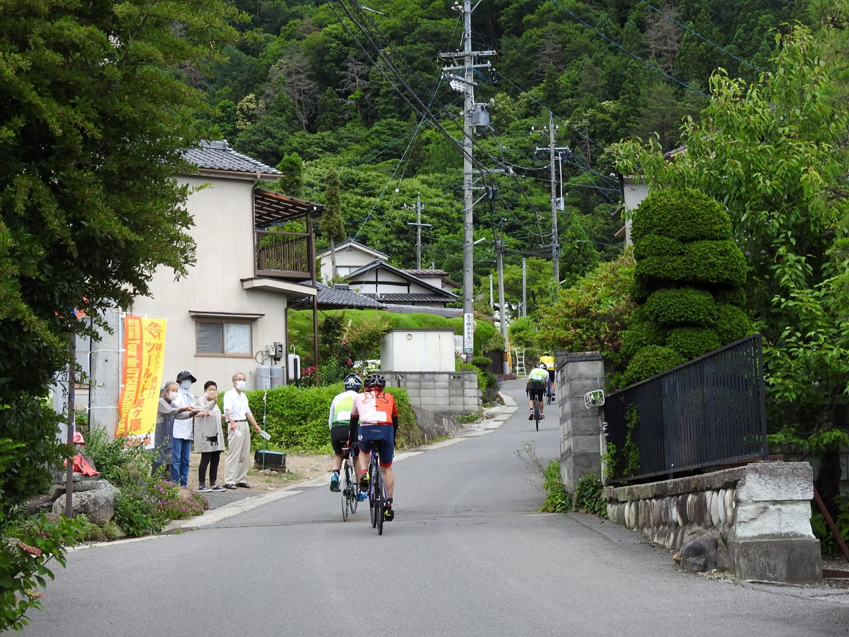Entlang der Straßen in den Wohngebieten haben sich Leute versammelt, um die Radfahrer bei ihrem steilen Aufstieg mit selbstgebastelten Krachmachern anzufeuern. Die Anwohner füllten dazu kleine Plastikflaschen mit Kügelchen und verteilten sie an die Schaulustigen, und davon gab es einige, obwohl die Tour schon um 7 Uhr morgens startete. In diesem Jahr nahmen ca. 1000 Radler teil, halb so viele wie vor der Corona-Pause.