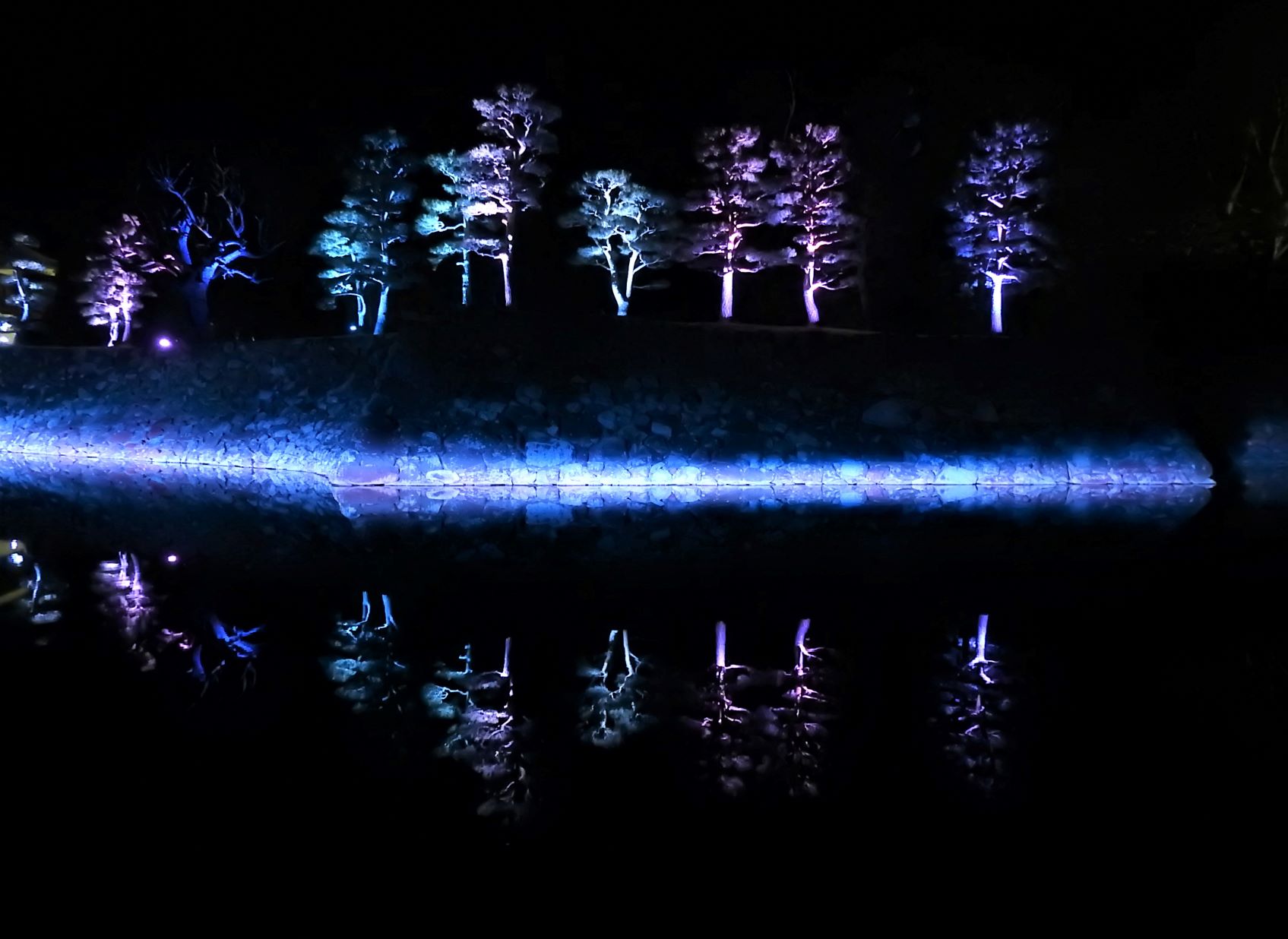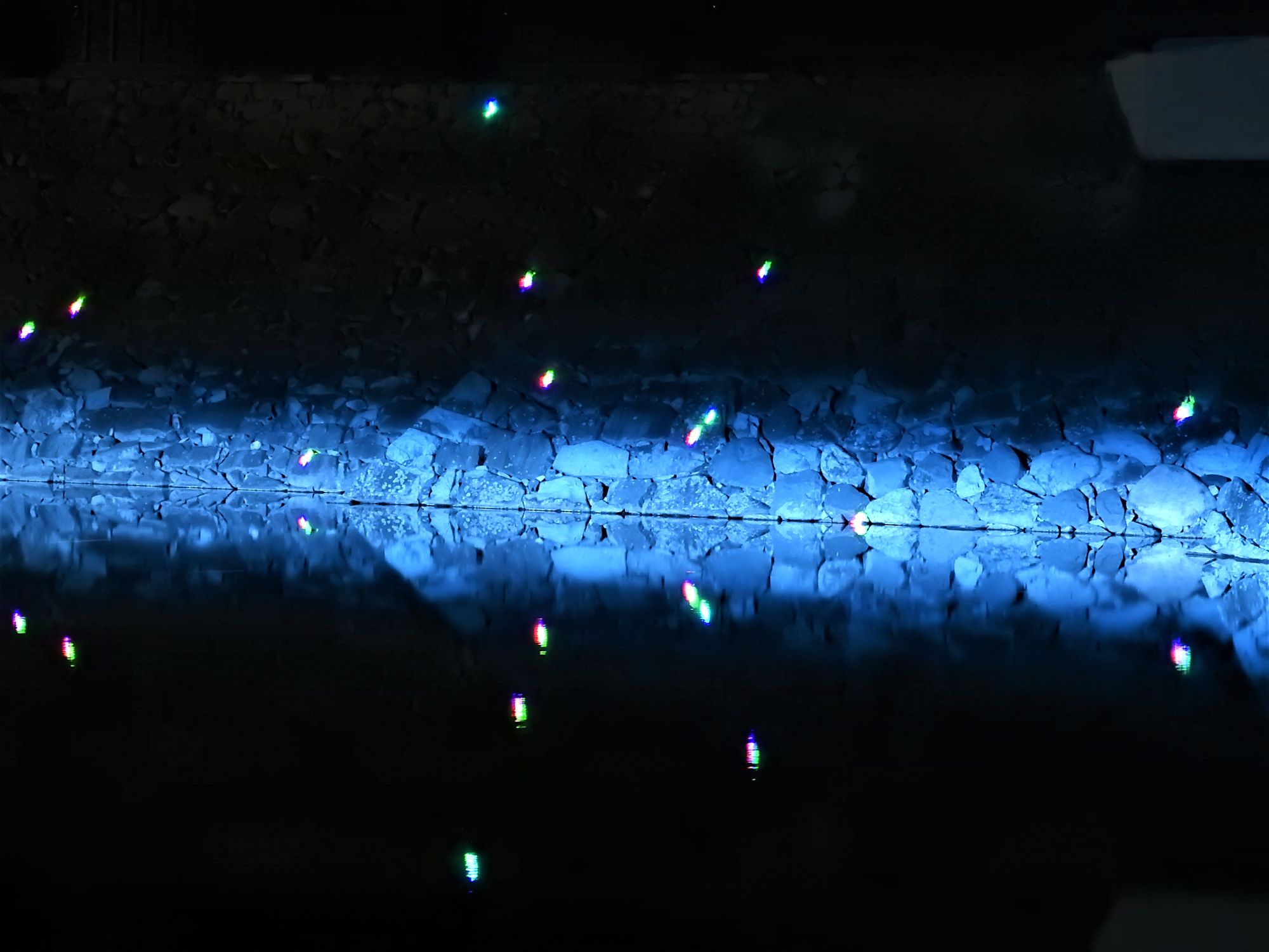 Die Wassertropfen, die sich über die Burg ergießen, die blauen Schneeflocken und das beleuchtete Wäldchen entführen in eine surreale Welt.