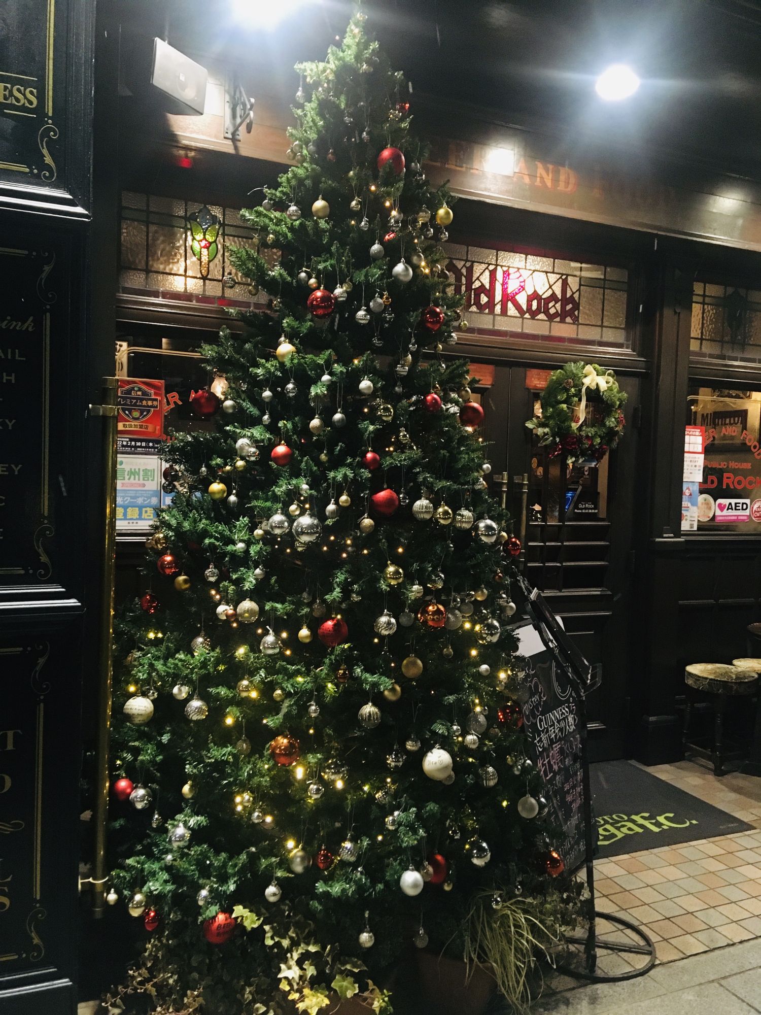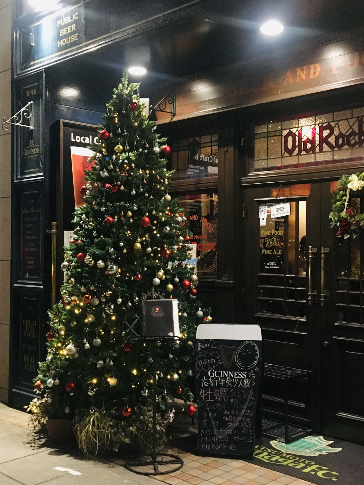Auf dem Weg zum Kaufhaus „Parco“, wo ein großer Baum stehen soll, fällt der Weihnachtsbaum am Pub „Old Rock“ auf, der für mich den idealen archetypischen Tannenbaum verkörpert.