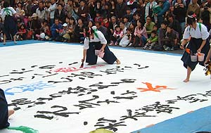 It was exiting and dynamic to see the girls draw big kanji characters on the road with their face and clothes spotted by Chinese ink. I heard the writing brush is so heavy (about 15kg) that they train their bodies.