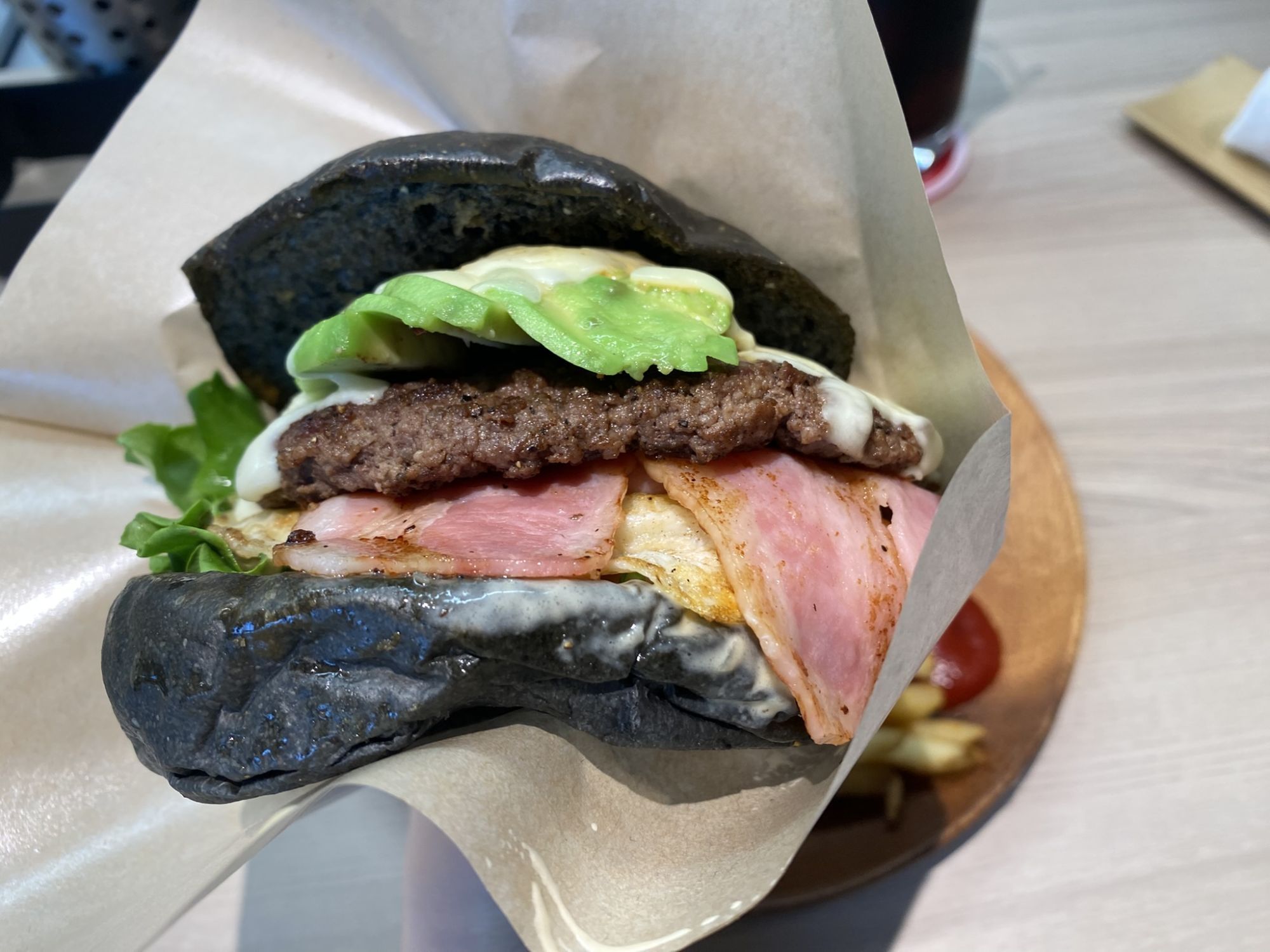 It consists of black bread, salad, avocado, mozzarella, egg, bacon and a beef patty.