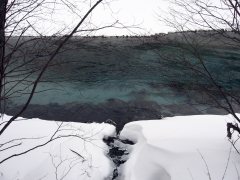 The beauty starts shortly after the Kama Tunnel at Taisho Pond. Overlooking the pond is its creator, Yakedake. This active volcano erupted in 1915, causing mudslides which created the pond by damming the Azusa River. The beginning of the trail wanders alongside the Azusa River and upon snow-covered boardwalks. On the way you may spot rabbit tracks near your own footprints, trout in shallow inlets, or monkeys searching for food in trees or on the rocky shore of the river.