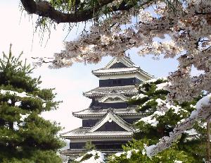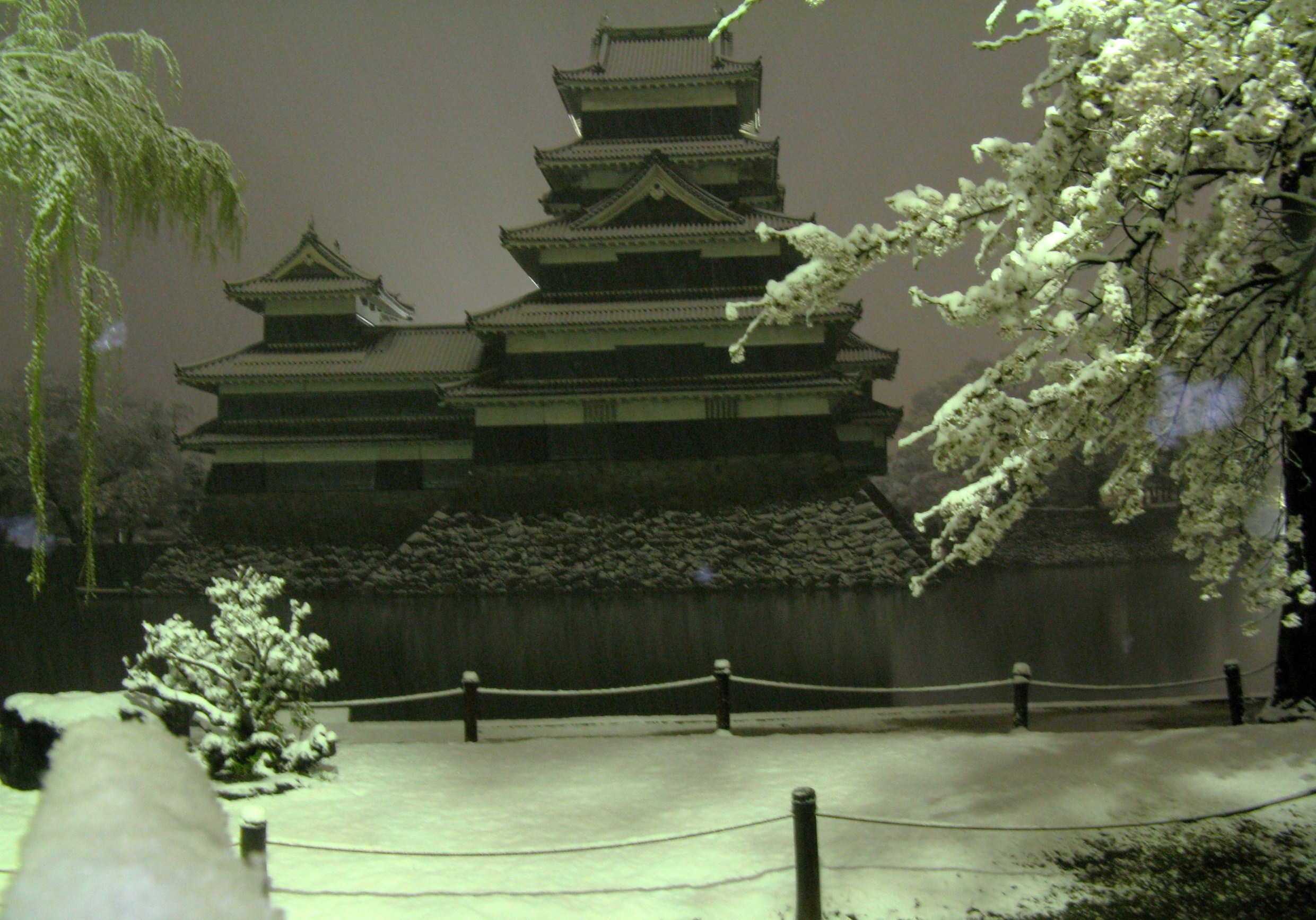 My night shots didn’t turn out so good anyway dispite having wasted a camera on them… Got a better shot in this one two years back(less the snow)with the Sakura somewhat visable on the left The moon rising over the castle and a famous Matsumoto rehydration facility lit up on the far right!(i.e.the roof top beer garden).