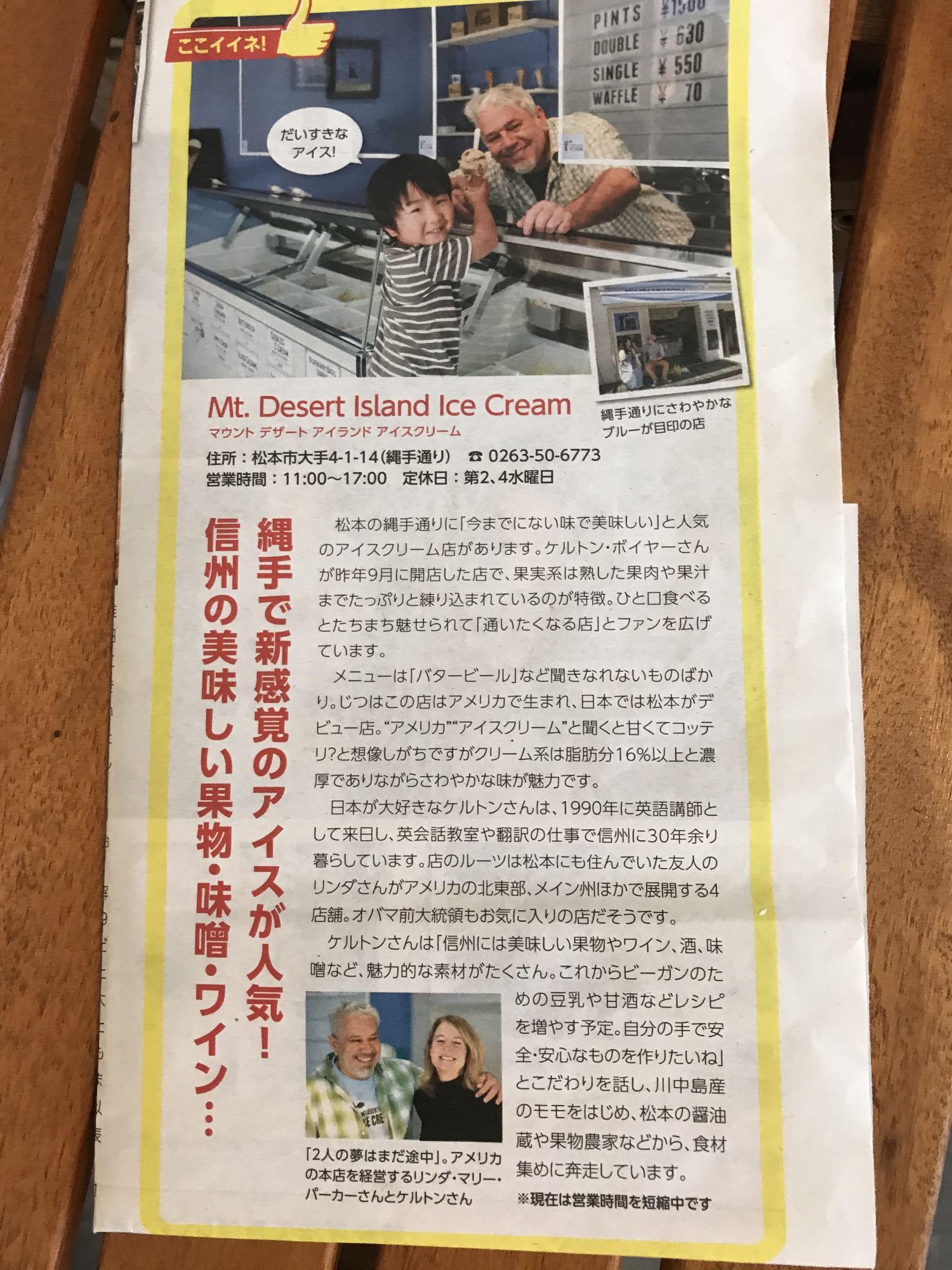 Mt. Desert Island Ice Cream был открыт в сентябре 2019 года и с тех пор радует жителей и гостей города самыми разнообразными и необычными вкусами.  Владелец — выходец из США по имени Келтон приехал в Мацумото 30 лет назад преподавать английский язык и волей случая познакомился с американкой Линдой, которая так же работала в школе. По окончанию своего контракта Линда отправилась домой в Америку, где в скором времени и открыла свой первый магазин мороженного. Успех не заставил себя долго ждать и теперь Линда управляет уже 4мя магазинами, которые вошли в 15 лучших заведений подающих мороженное по мнению Travel Awaids. Именно она вдохновила Келтона на открытие дочернего заведения в Японии.