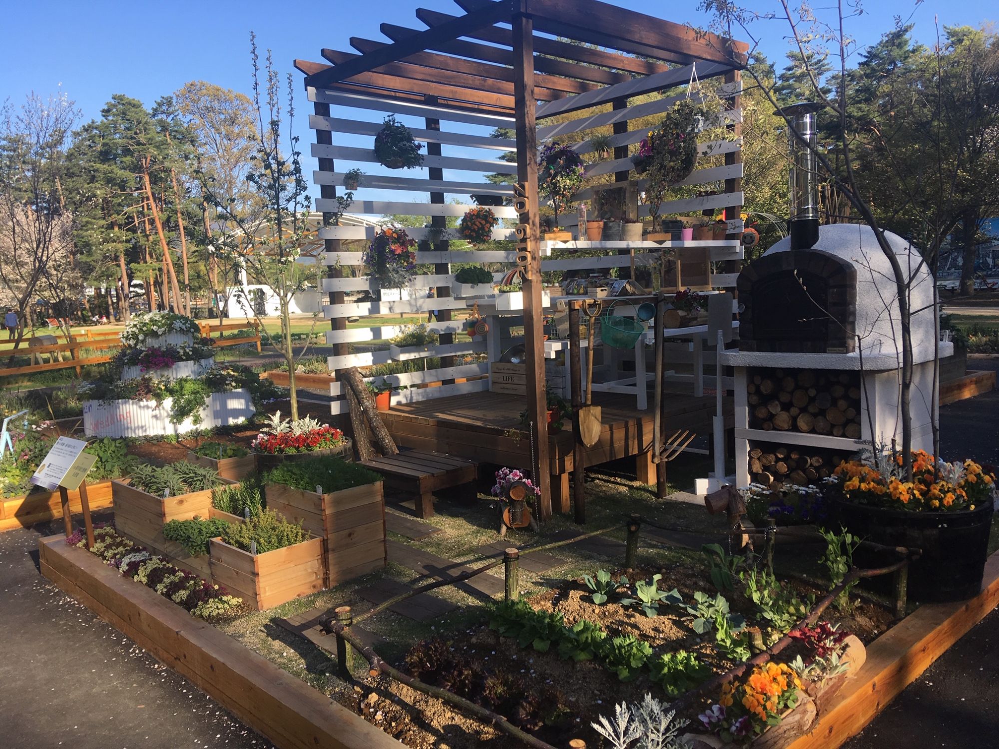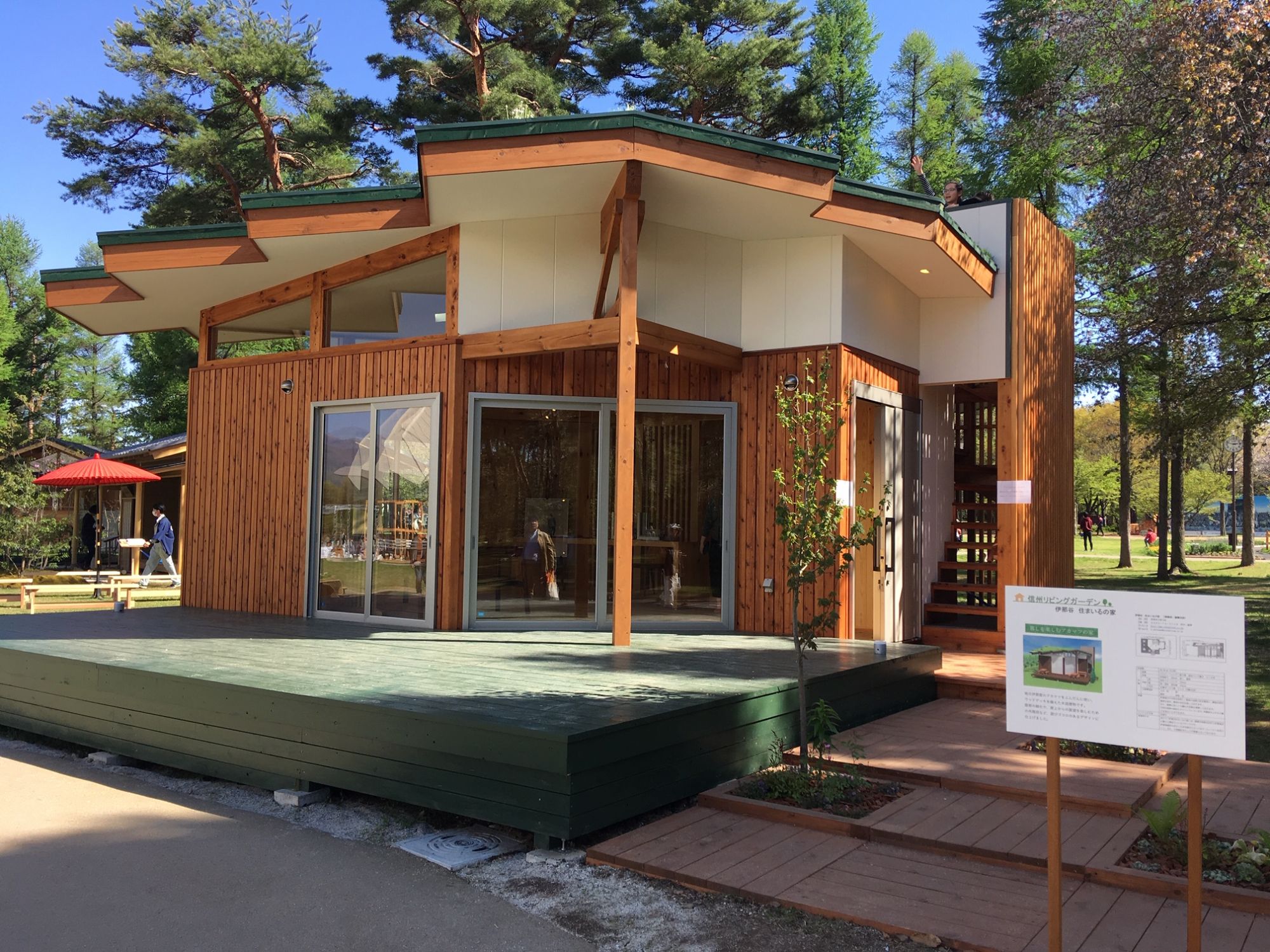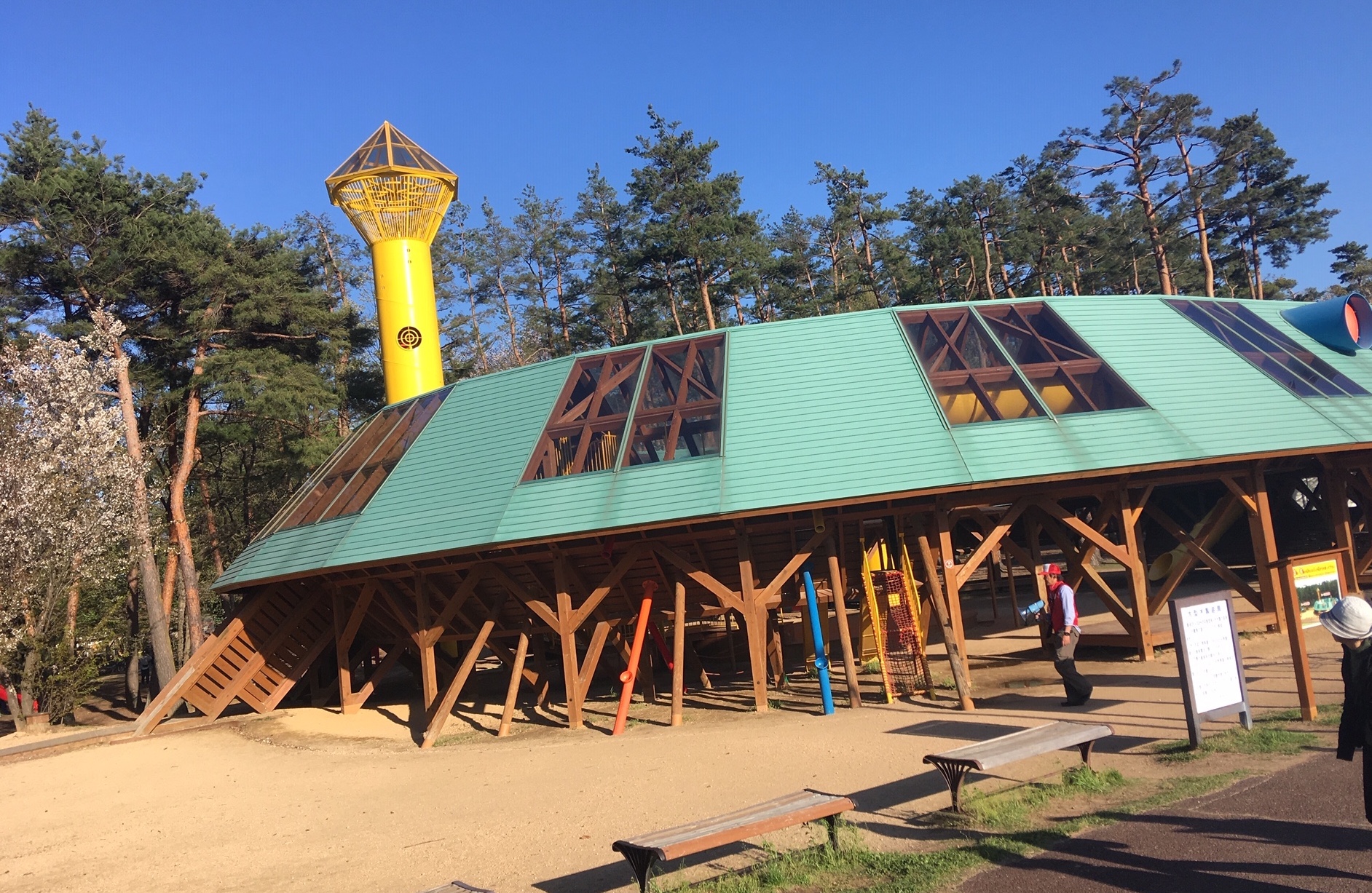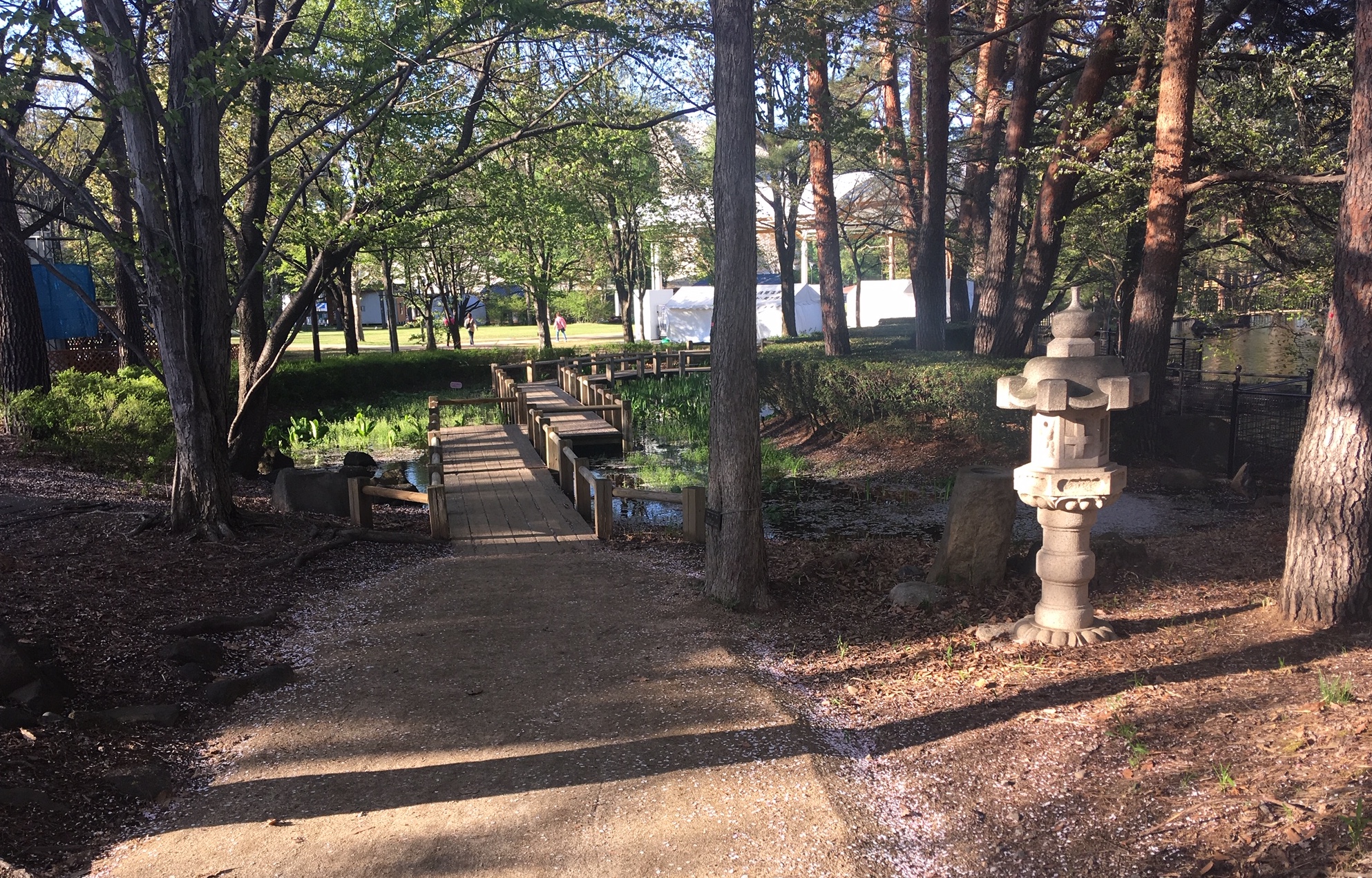 Здесь есть дорожки для езды на велосипедах, увлекательный деревянный лабиринт для детворы, водоем с фонтаном и выставочный павильон Ямабико Дом.