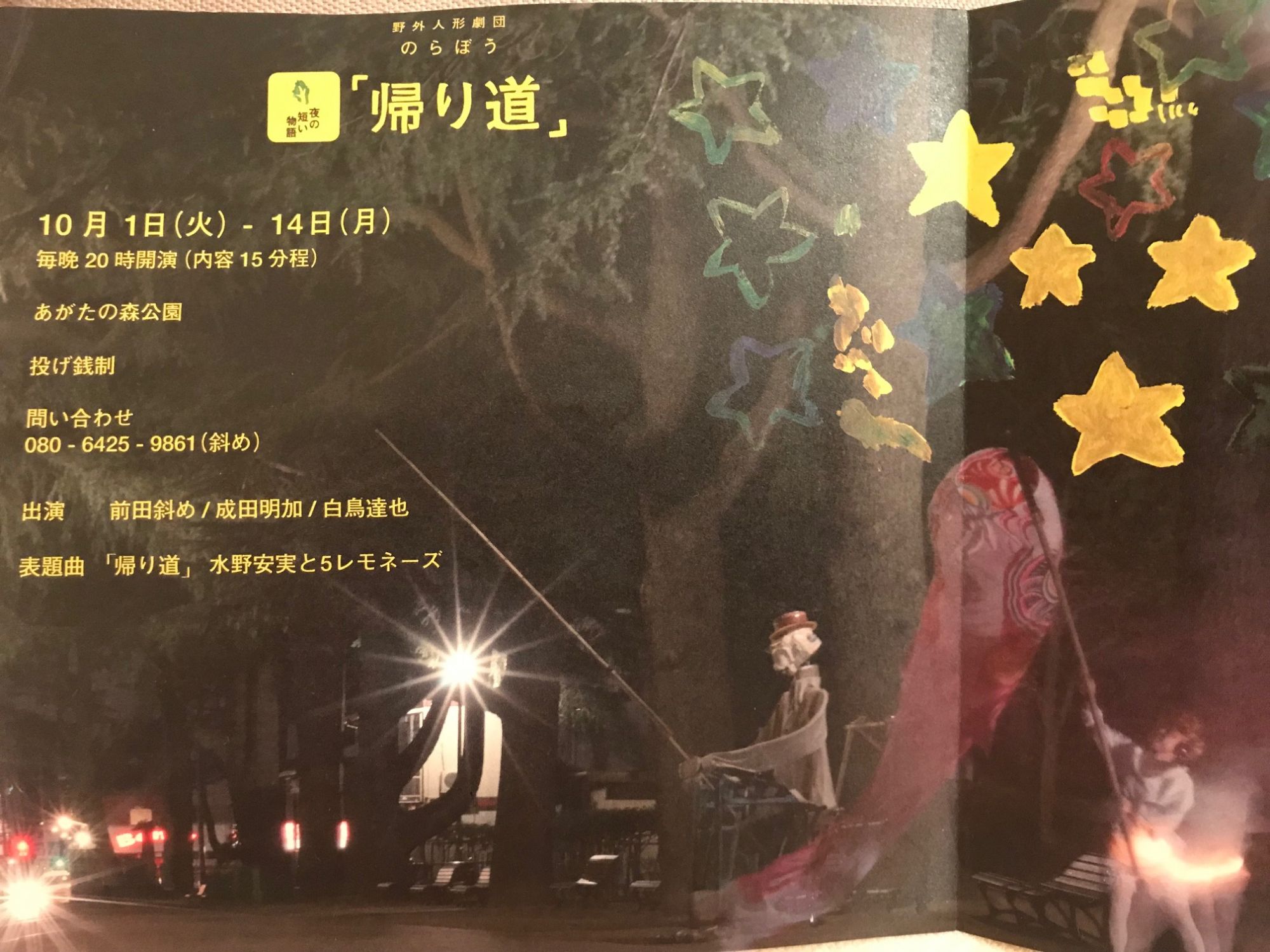 С 1го по 14е октября местная театральная труппа представляет свою новую постановку «Дорога домой». Действие разворачивается непосредственно в парке Агатано Мори каждый вечер в 20:00.