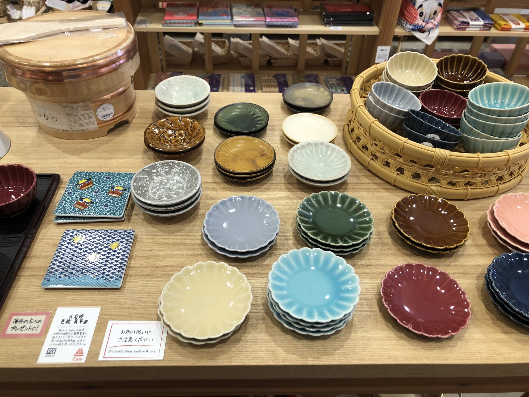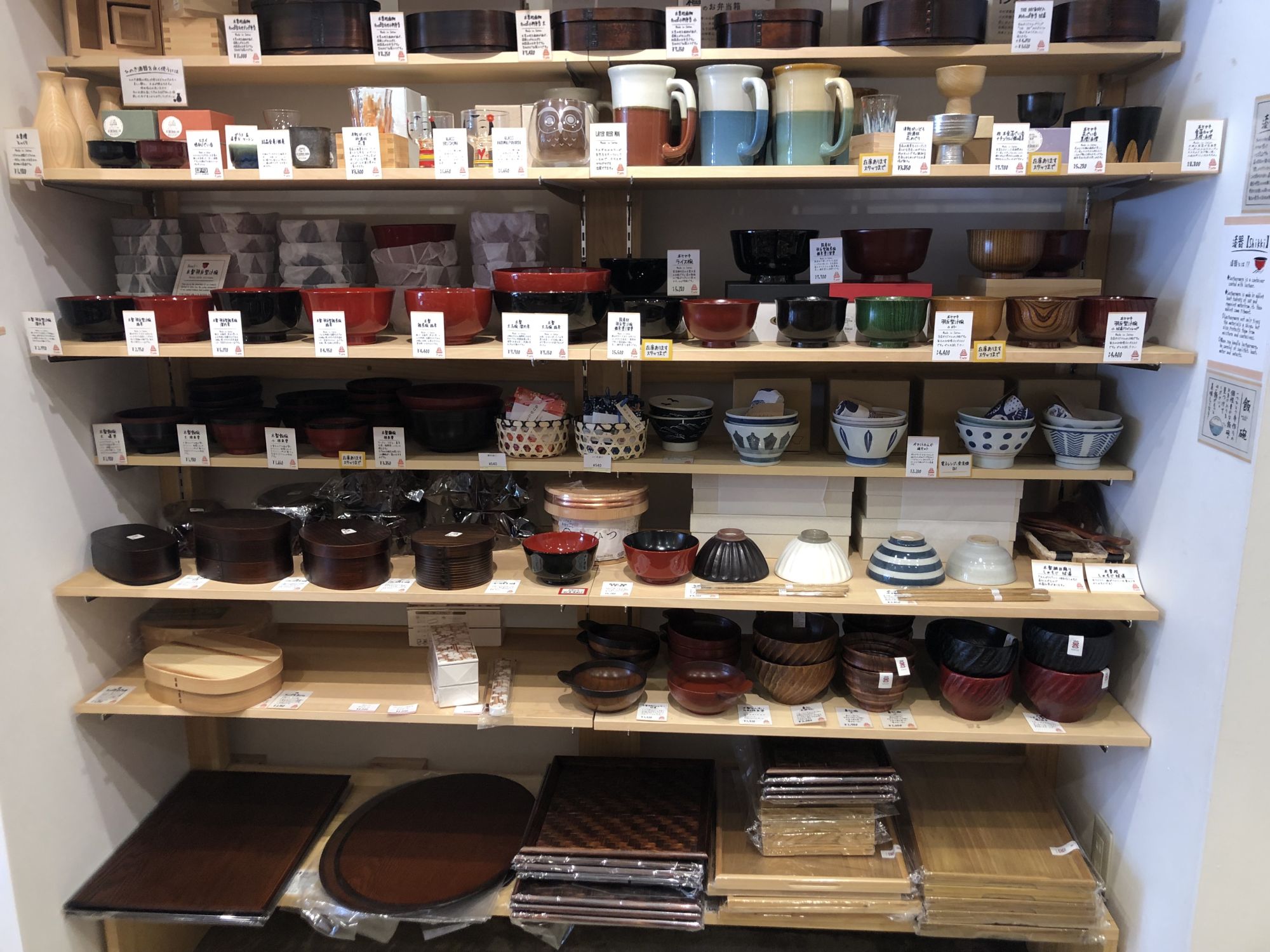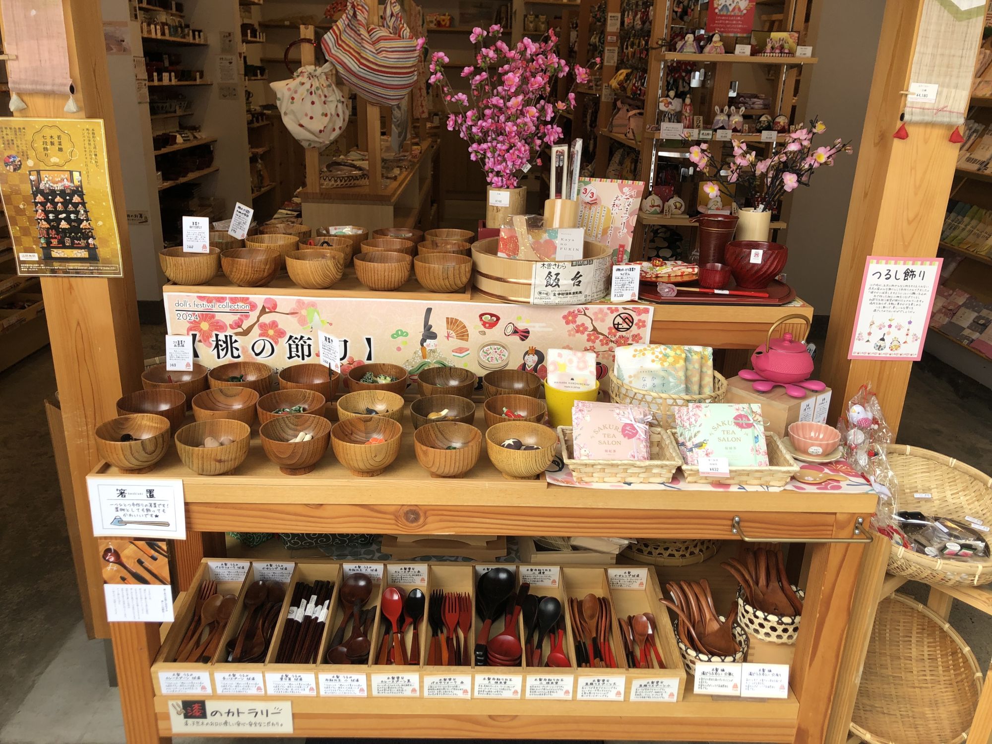 สินค้าที่ทำจากไม้ ช้อน ชาม ตะเกียบ ถาด กล่องข้าวที่ทำจากไม้ และเครื่องปั้นดินเผา