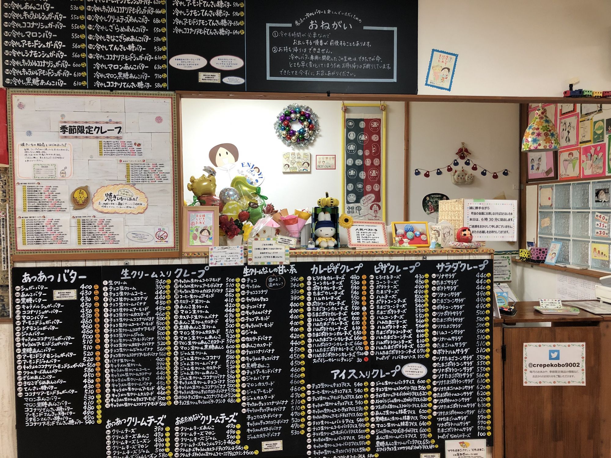 นอกจากเครปไส้วิปครีม (หรือจะไม่เอาวิปครีมก็ได้) เครปพิซซ่าที่สามารถพบเห็นได้ทั่วไปแล้วแล้ว ที่นี่ยังมีเครปสลัดผักด้วยนะคะ มีสลัดให้เลือกมากมายเช่น สลัดทูน่า สลัดไข่ สลัดมันฝรั่ง แฮมข้าวโพด ทูน่าข้าวโพด หรือจะไส่ทั้ง ทูน่า ไข่ แฮม ข้าวโพดก็ได้ ห่อด้วยแป้งเครปกรอบๆ ซึ่งเป็นเมนูที่ได้รับความนิยมมากๆ ด้วยค่ะแต่ขอบอกว่าถ้าไส่ไส้หลายอย่าง ราคาอาจถึง 700 เยนได้ สำหรับเครปไส้สลัดที่ผ่านมายังไม่เคยลองชิมแต่ถ้าได้ชิมแล้วจะนำมาเขียนรีวิวอีกนะคะ ราคาจะเขียนไว้ที่เมนู ตัวหนังสือสีขาวคือราคาไม่รวมภาษี ส่วนในวงกลมสีเหลืองๆ คือ ราคาที่รวมภาษีแล้วค่ะ