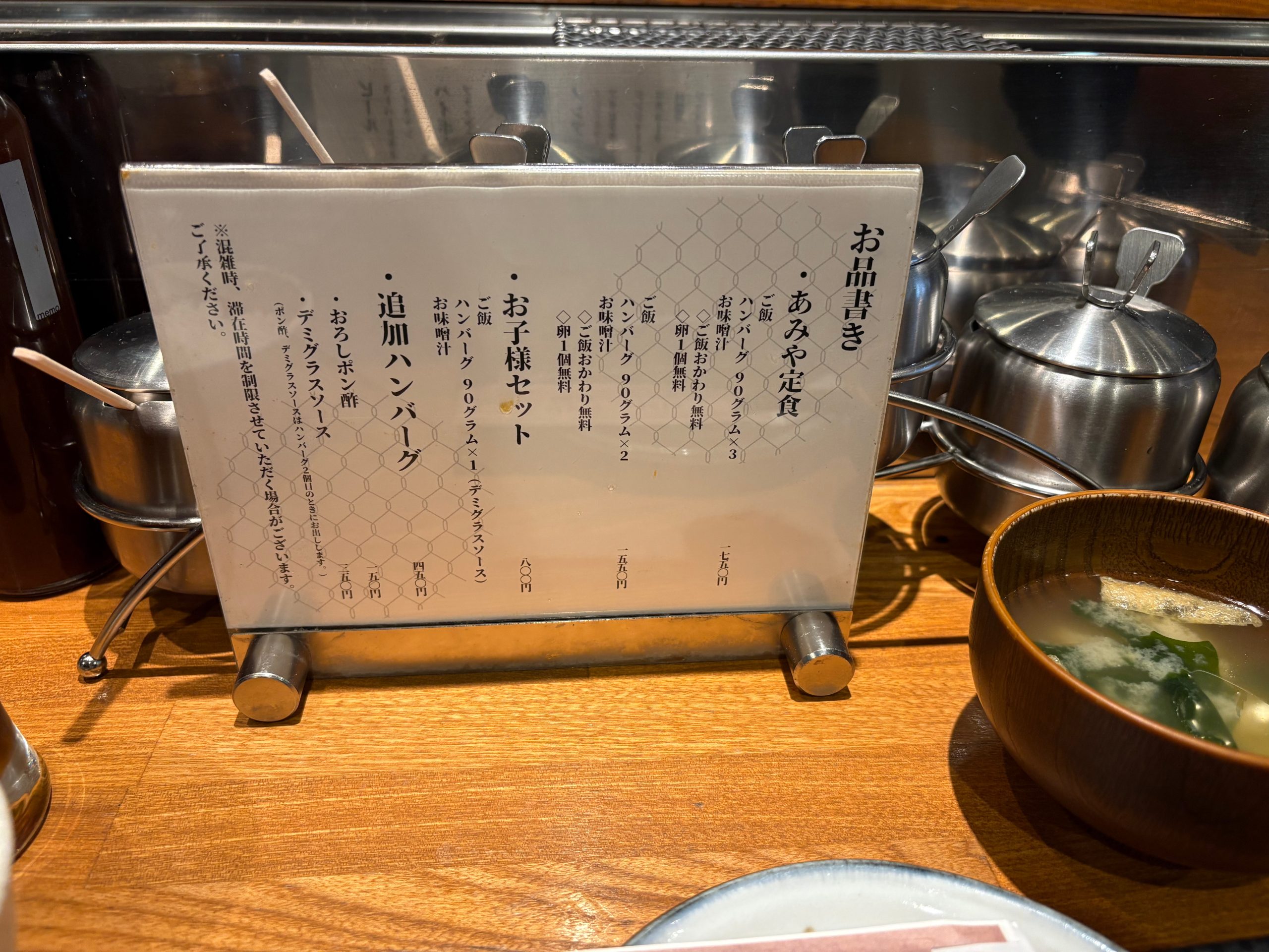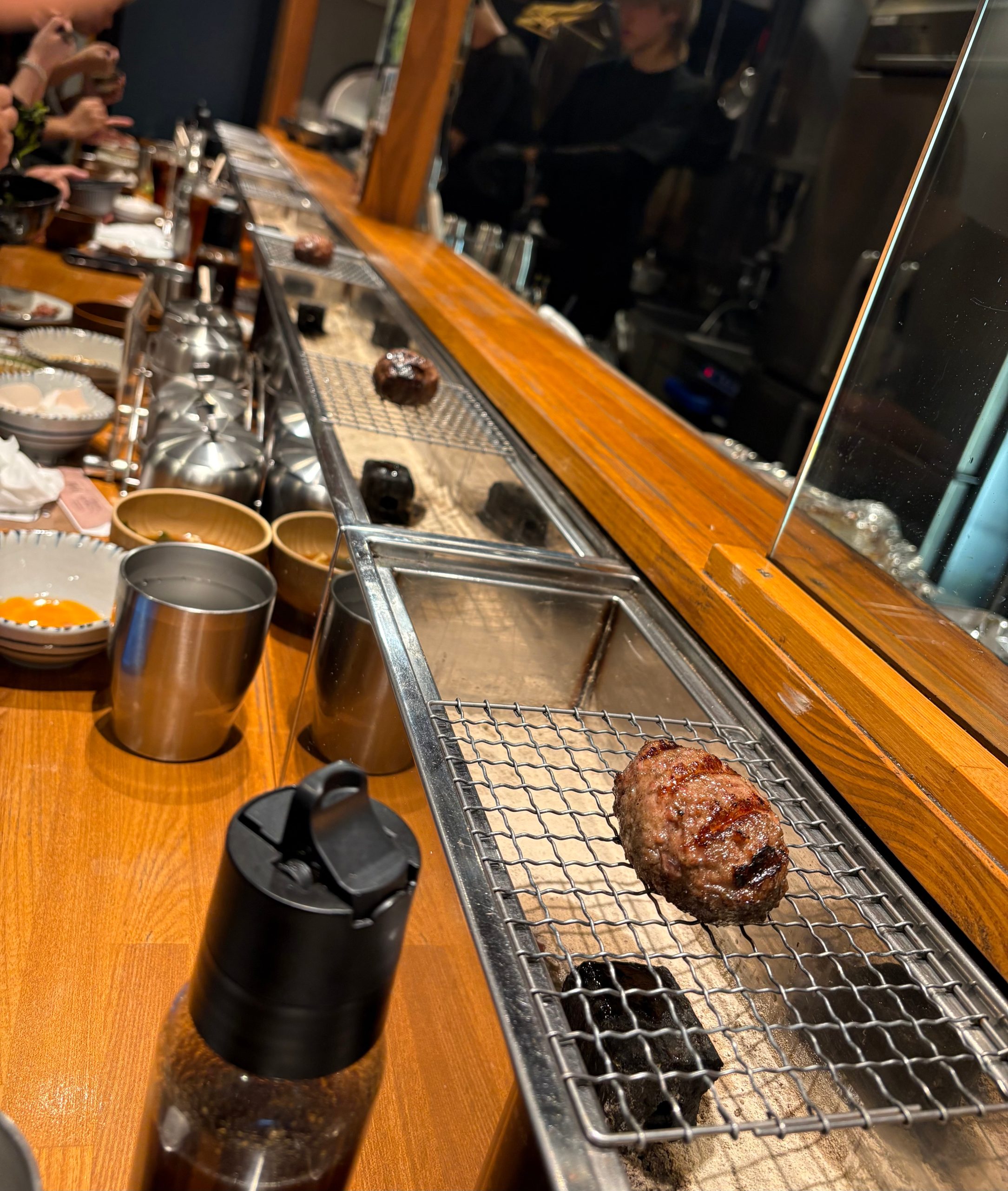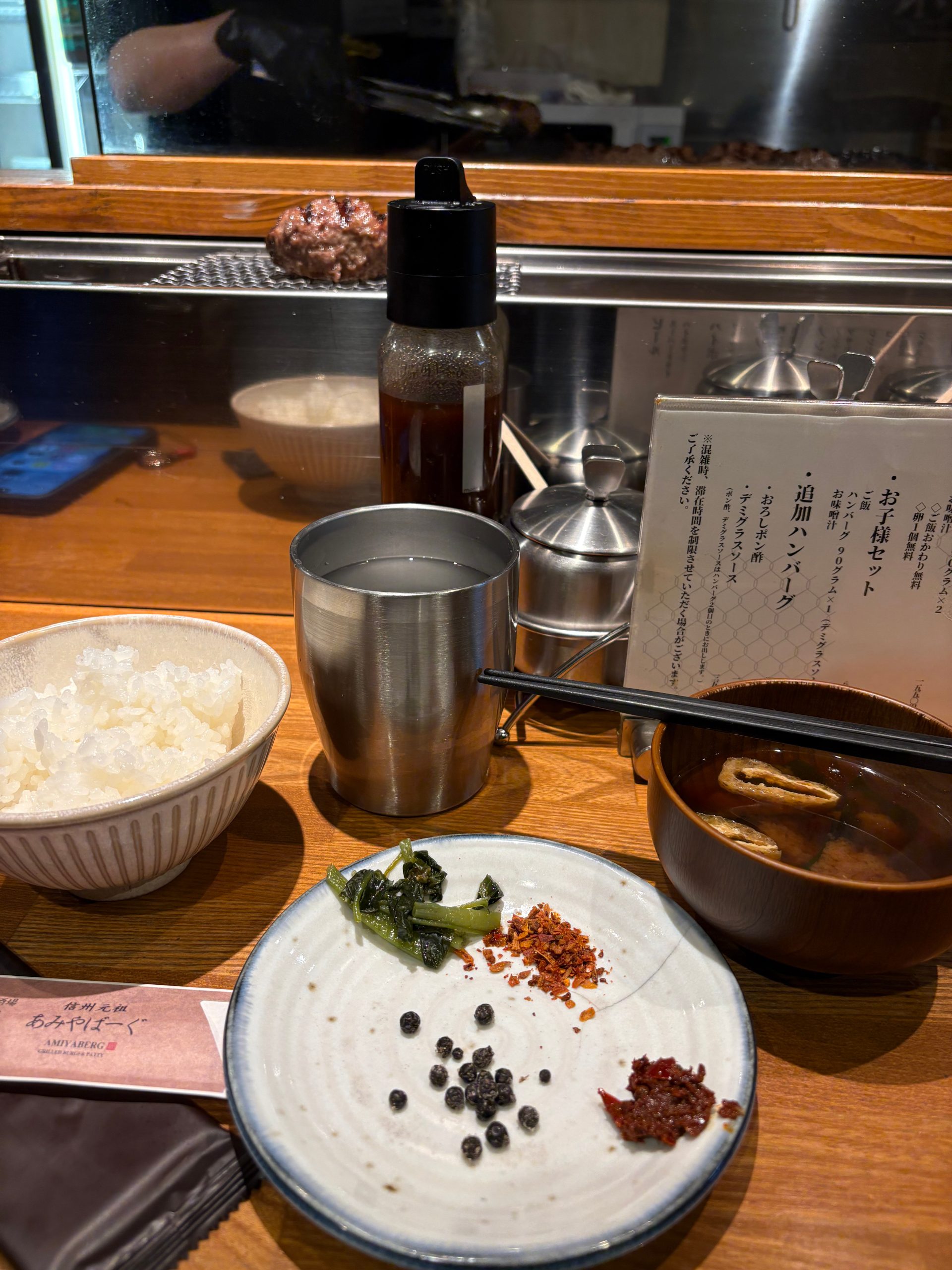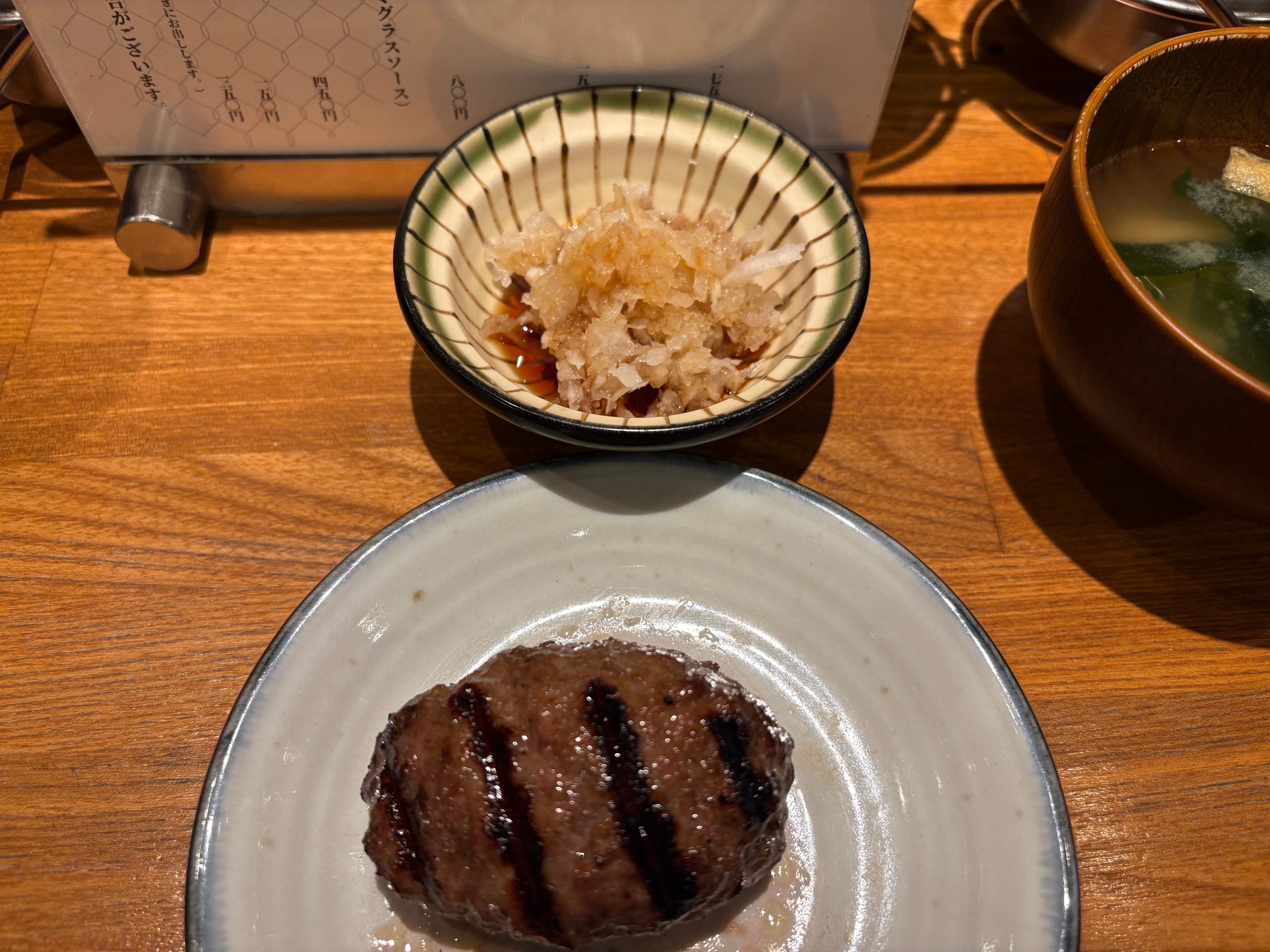 สำหรับอาหารมื้อกลางวันเค้าจะมีเมนูให้เลือก 2 ราคา คือ แฮมเบิร์ก 3 ชิ้น+ข้าว(เติมได้ไม่อั้น)+ซุปมิโซ+ไข่ดิบฟรี 1 ใบ 1,750 เยน กับแฮมเบิร์ก 2 ชิ้น+ข้าว(เติมได้ไม่อั้น)+ซุปมิโซ+ไข่ดิบฟรี 1 ใบ 1,550 เยน (แนะนำให้สั่งชุดแบบ 3 ชิ้นคุ้มกว่าเพราะแฮมเบิร์กอร่อยมาก) หากต้องการสั่งแฮมเบิร์กเพิ่ม ราคาชิ้นละ 450 เยน แฮมเบิร์กที่เค้าย่างถ่านเสร็จแล้วเค้าจะเอามาวางไว้บนตระแกรงตรงที่นั่งของลูกค้า ลูกค้าก็คีบทานตามชอบ แต่ทางร้านเค้าจะแนะนำว่าชิ้นแรกลองทานเปล่าๆ แบไม่ต้องราดซ้อสก่อนจะได้ลิ้มรสชาติแฮมเบิร์กอย่างเต็มที่