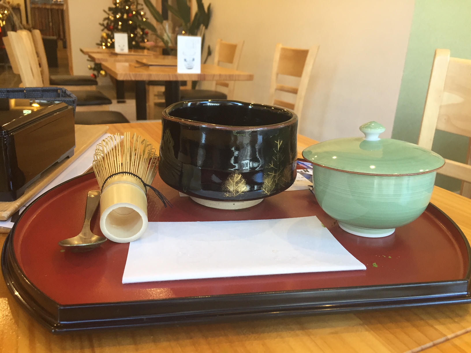 จากนั้นก็จะนำชาผง น้ำร้อน และไม้ไผ่สำหรับชงชา รวมทั้งขนมหวานสำหรับทานพร้อมกับชามาให้