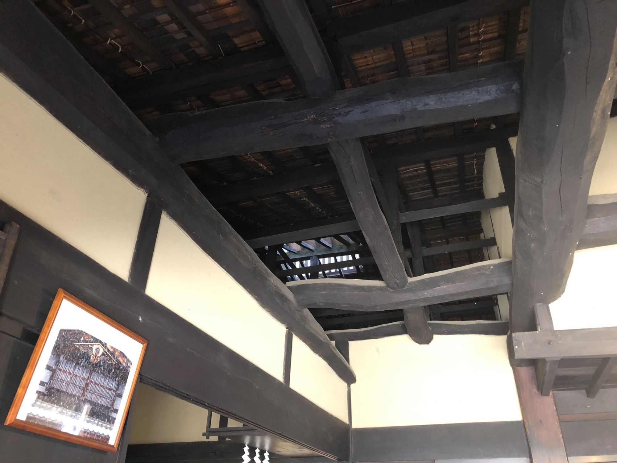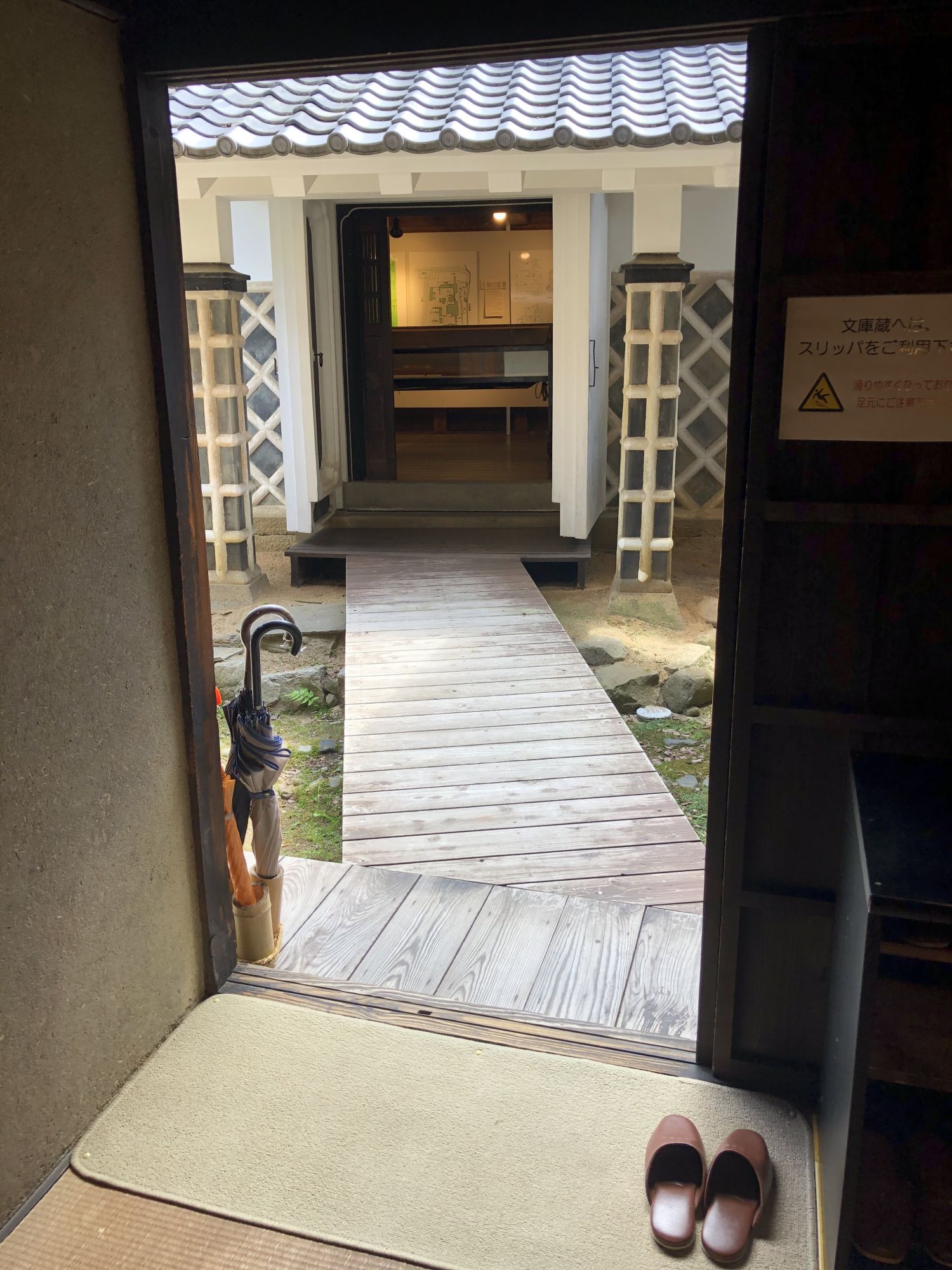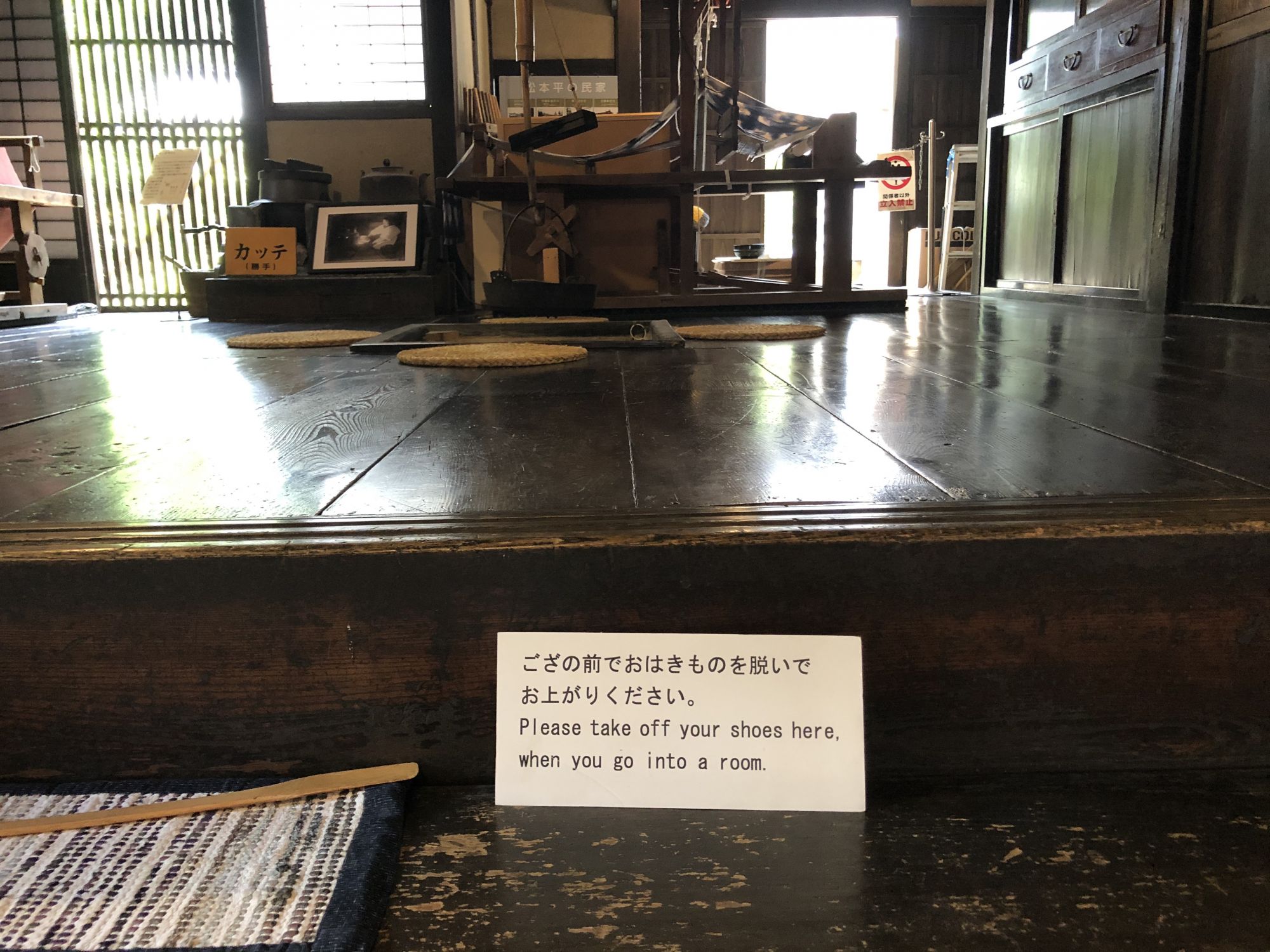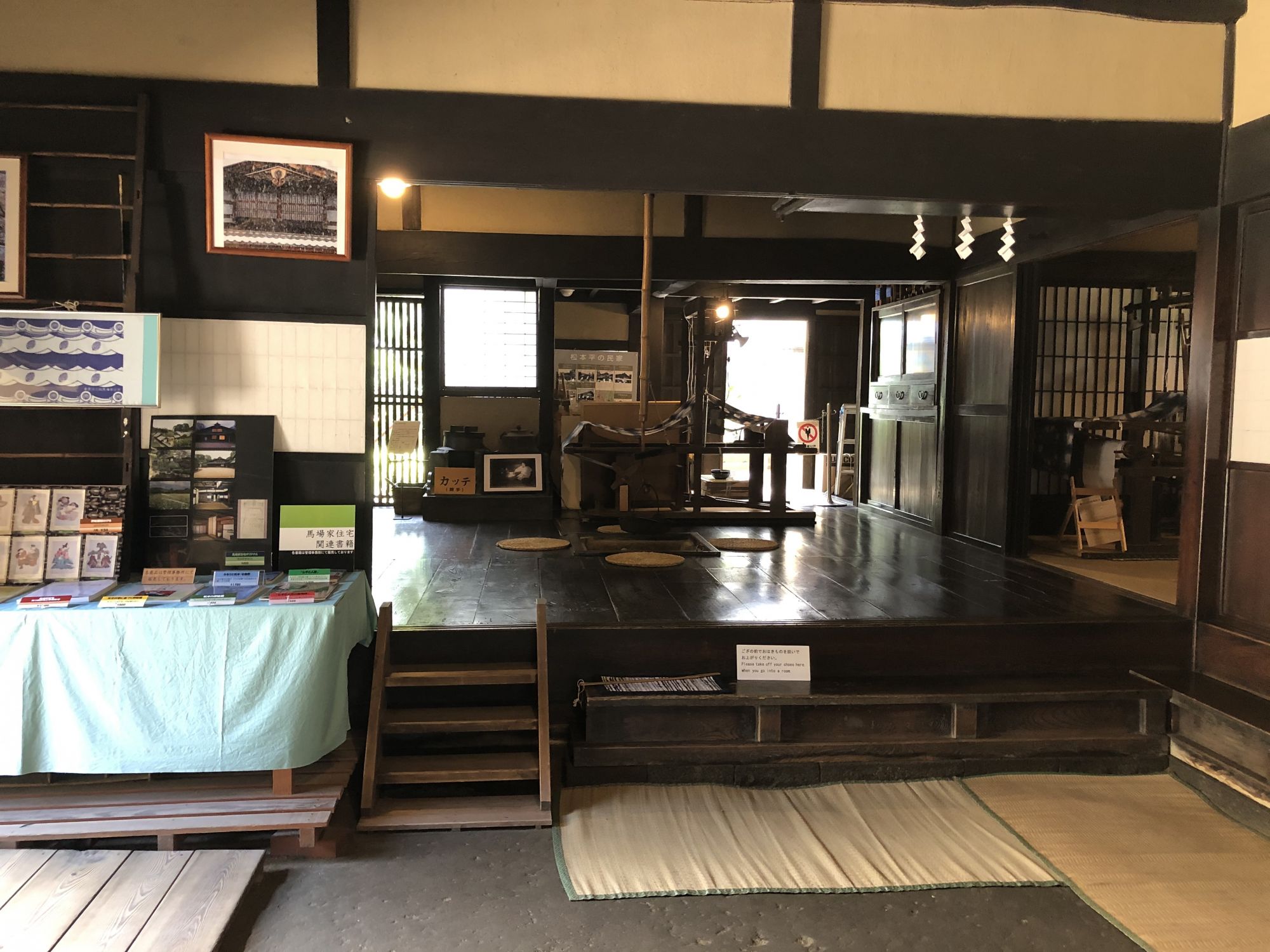 การเยี่ยมชมภายในบ้านจะต้องถอดรองเท้าไว้ที่พื้นดิน ห้ามถอดบนเสื่อทาทามินะคะ ที่หอเก็บเอกสารได้จัดแสดงกระเบื้องมุงหลังคาและไม้ประดับบริเวณปั้นลม กระเป๋าเดินทางของเจ้าของบ้านรุ่นที่ 15 ซึ่งดำรงตำแหน่งเป็นเจ้าหน้าที่การทูตในยุคเมจิ หากจะไปที่หอเก็บเอกสาร ซึ่งเป็นอาคารผนังสีขาวที่อยู่ใกล้ๆตัวบ้านจะต้องสวมรองเท้าแตะที่ถูกเตรียมไว้ที่ชั้นวางรองเท้า