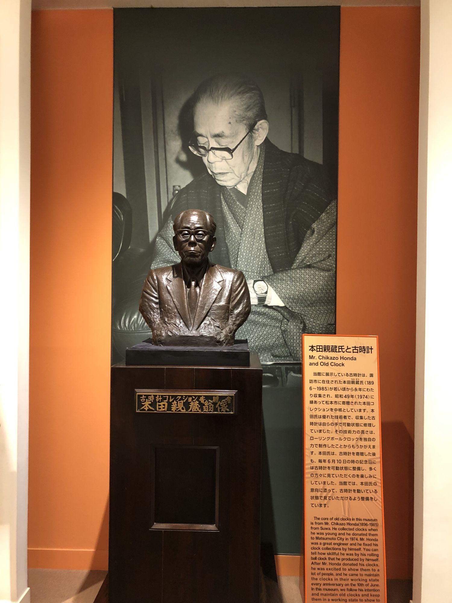 รูปปั้นคุณชิกาโซ ฮงดะ (ค.ศ.1896-1985) ผู้บริจาคนาฬิกาให้กับเมืองมัตสึโมโต้ ข้างๆ กับรูปปั้นของคุณชิกาโซ ฮงดะ มีนาฬิกา “Rolling Ball Clock” ซึ่งเป็นนาฬิกาที่คุณฮงดะประดิษฐ์ขึ้นมาเอง