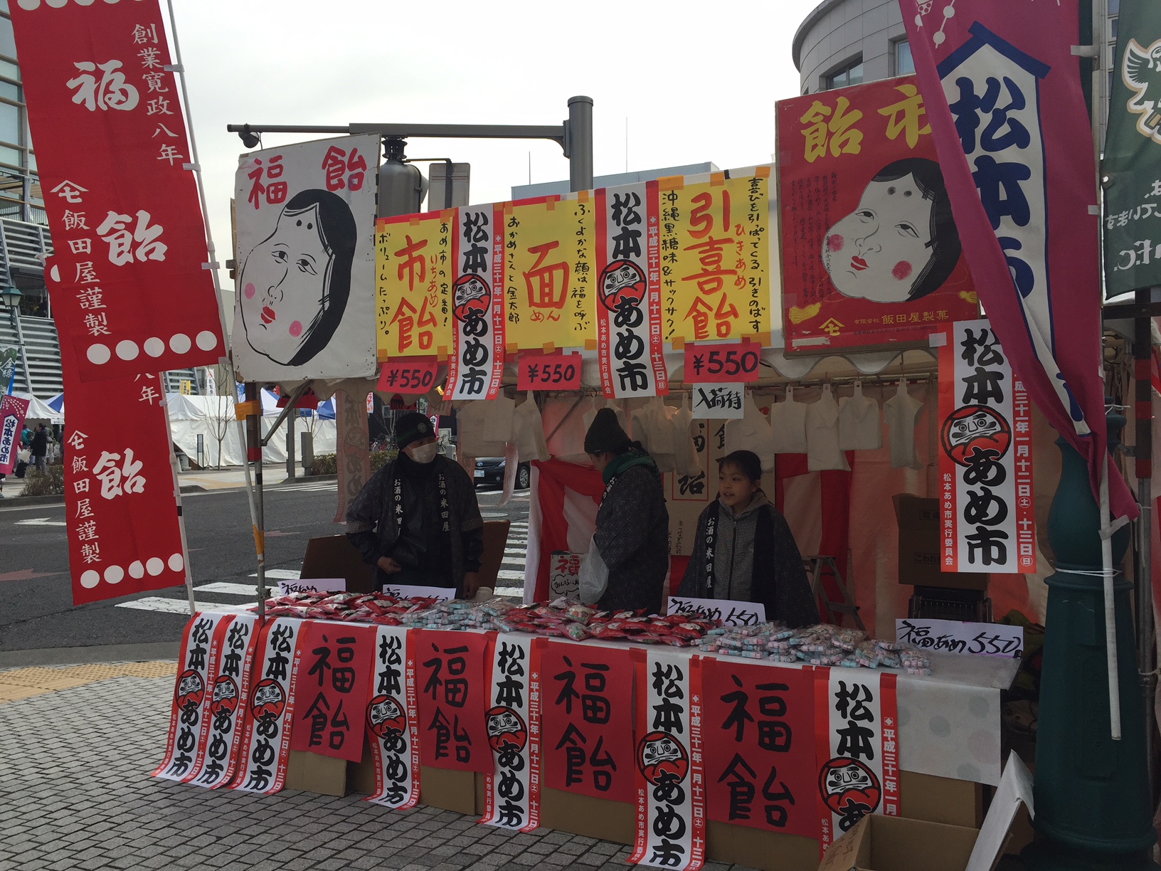ในเมืองมัตสึโมโต้เทศกาลลูกกวาดจะจัดขึ้นใกล้ๆกับเทศกาลซันคุโร่ ซึ่งเป็นเทศกาลที่ชาวบ้านจะนำตุ๊กตาดารุมะและเครื่องรางของปีก่อน มาเผาในกระโจมที่ทำจากกิ่งต้นสนและฟางข้าว (เครื่องรางนำโชคต่างๆ จะไม่นำไปทิ้งรวมกับขยะแต่จะทำโดยการเผาหรือนำไปวางที่ศาลเจ้าแทน)