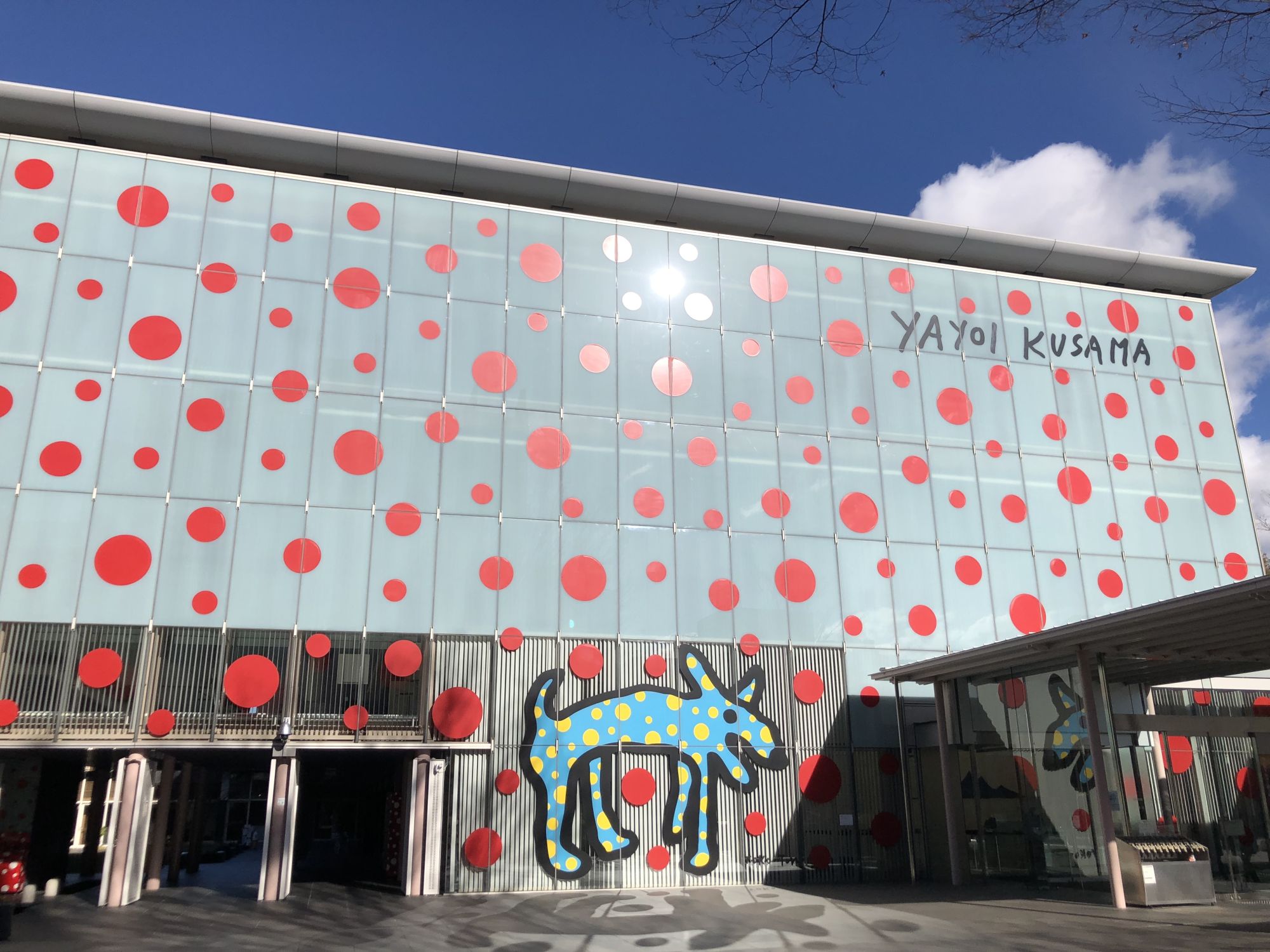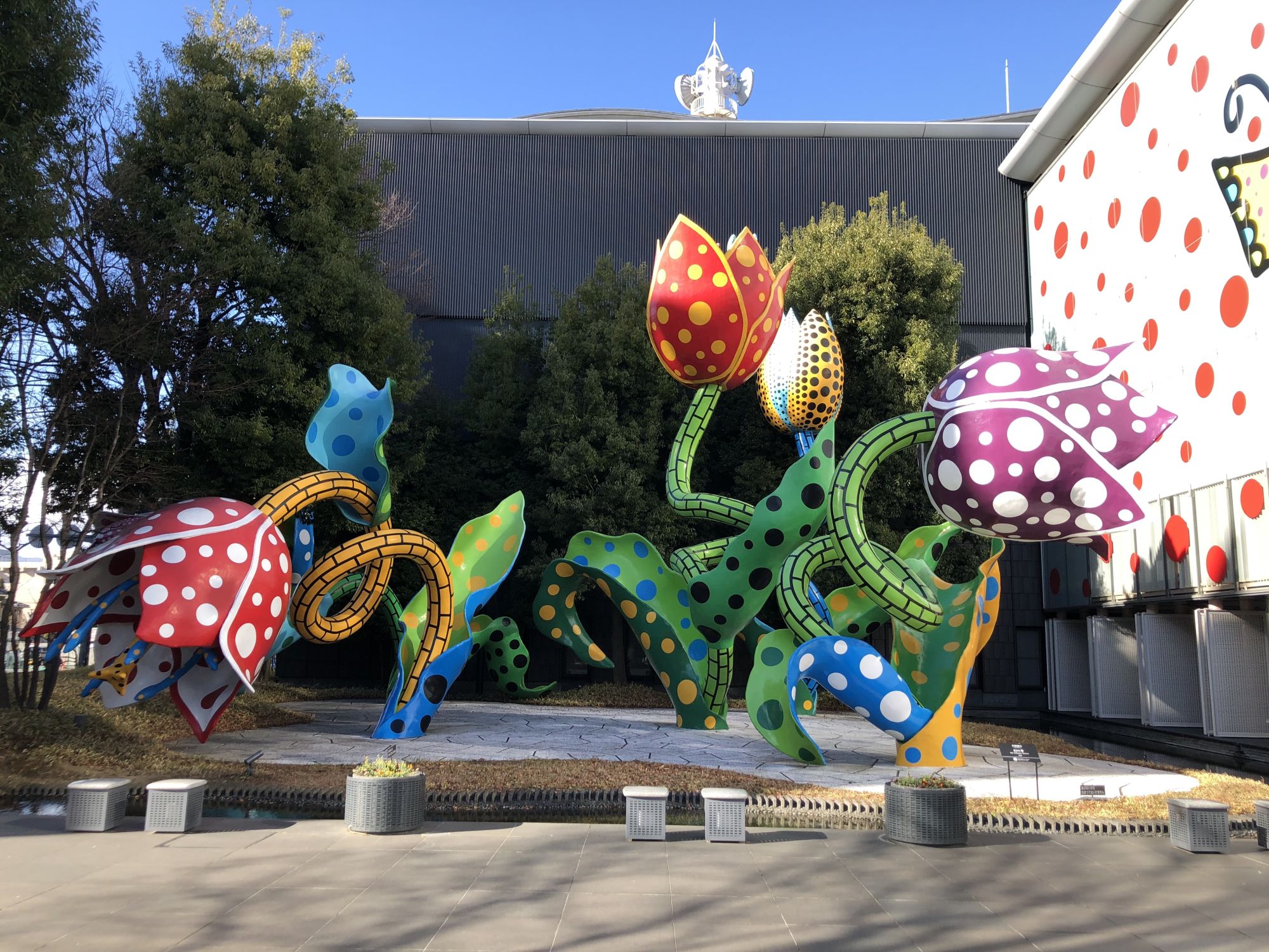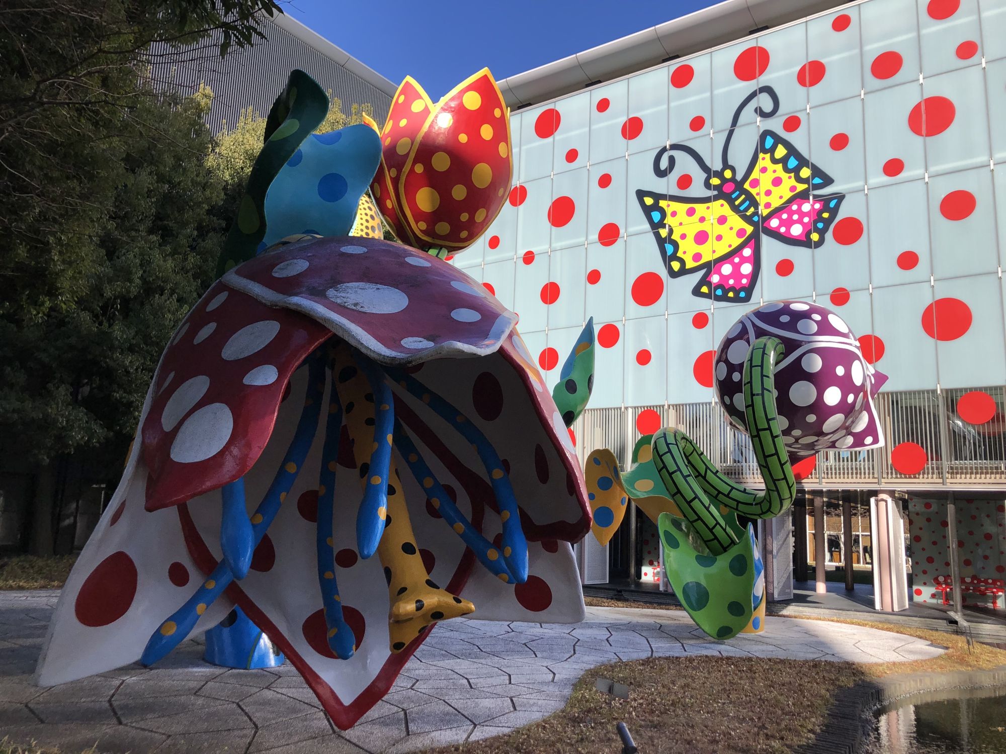 ด้านนอกของพิพิธภัณฑ์จัดแสดงผลงานศิลปะของ “คุซามะ ยาโยอิ” เป็นรูปทรงดอกไม้ประหลาด ภายในตัวอาคารชั้น 1 ของพิพิธภัณฑ์ เป็นเคาน์เตอร์จำหน่ายตั๋ว มีร้านขายของที่ระลึก ด้านหลังมีสวนให้นั่งพักผ่อนและถัดจากสวนจะมีร้านอาหารและคาเฟ่