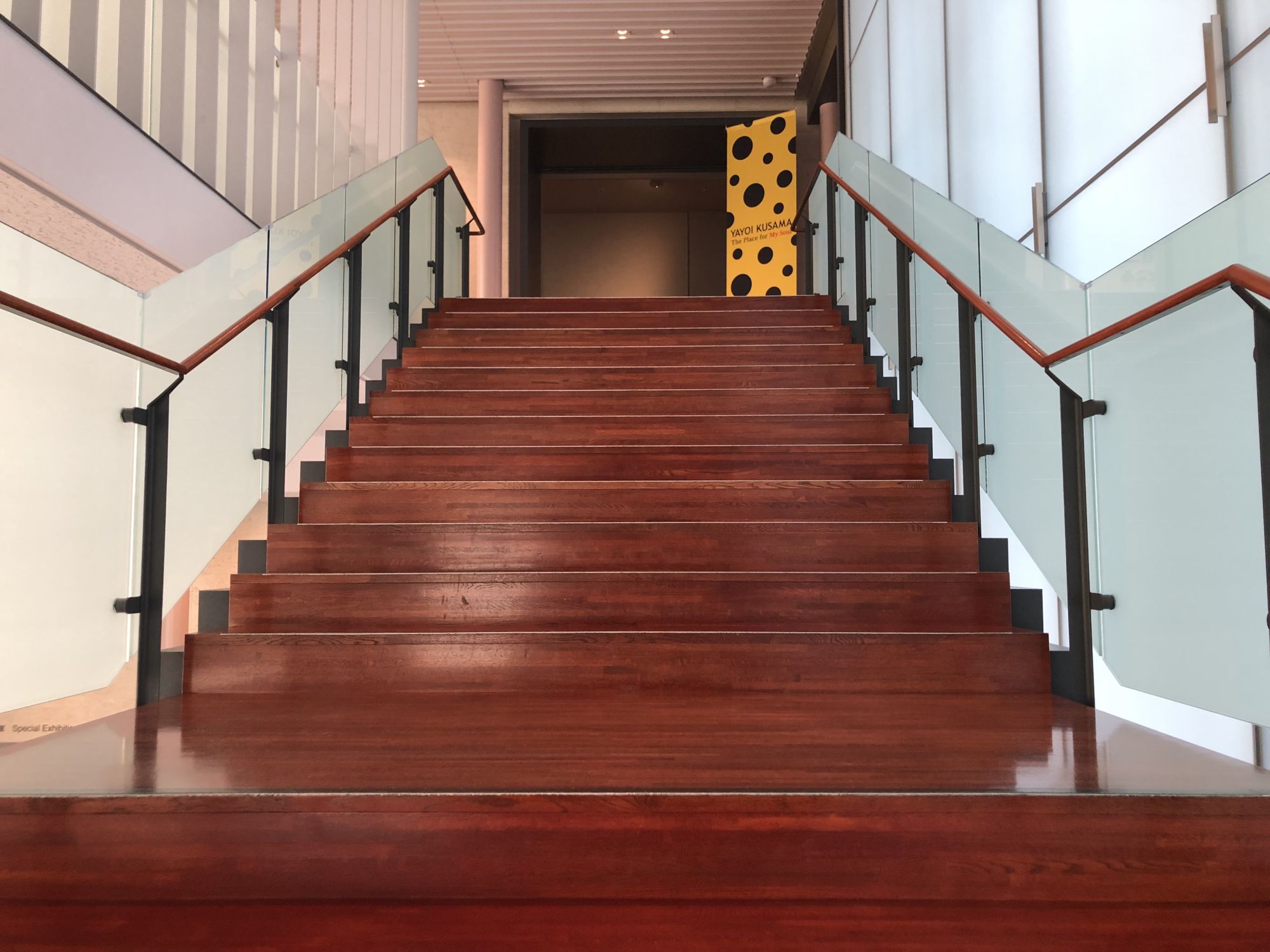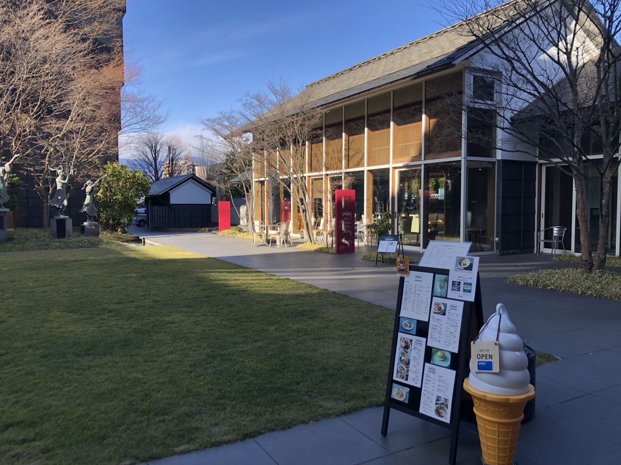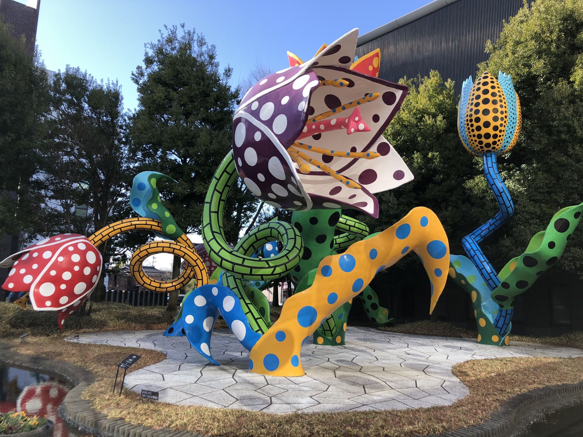 ด้านนอกของพิพิธภัณฑ์จัดแสดงผลงานศิลปะของ “คุซามะ ยาโยอิ” เป็นรูปทรงดอกไม้ประหลาด ภายในตัวอาคารชั้น 1 ของพิพิธภัณฑ์ เป็นเคาน์เตอร์จำหน่ายตั๋ว มีร้านขายของที่ระลึก ด้านหลังมีสวนให้นั่งพักผ่อนและถัดจากสวนจะมีร้านอาหารและคาเฟ่