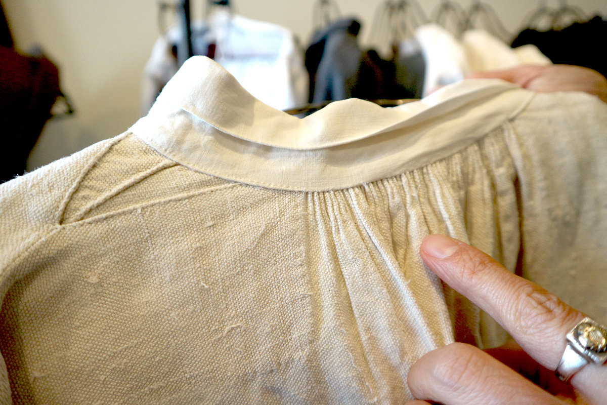 ミニタリ―ものデットストックフレンチリネンのワンピースは、100年以上前に作られた手縫いのもので、着てみるとその着心地の良さに驚きます。