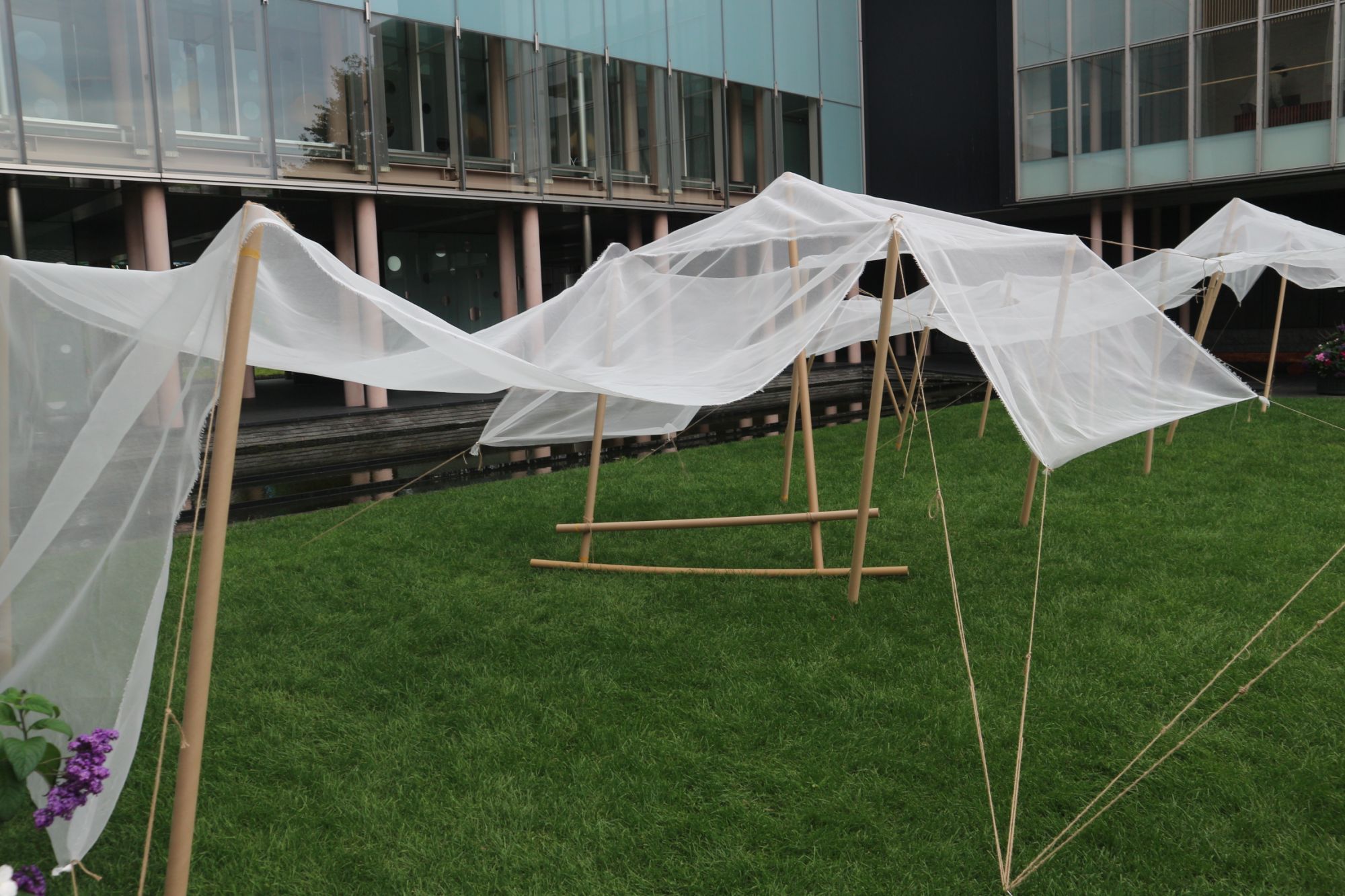 身近な素材でつくった空間の中に入ることで、新しい体験や感性をひろげるワークショップ・インスタント建築。今回は、紙管(再生資材)や布などの自然素材を使って中庭に屋根を張りみんなで遊ぼう!