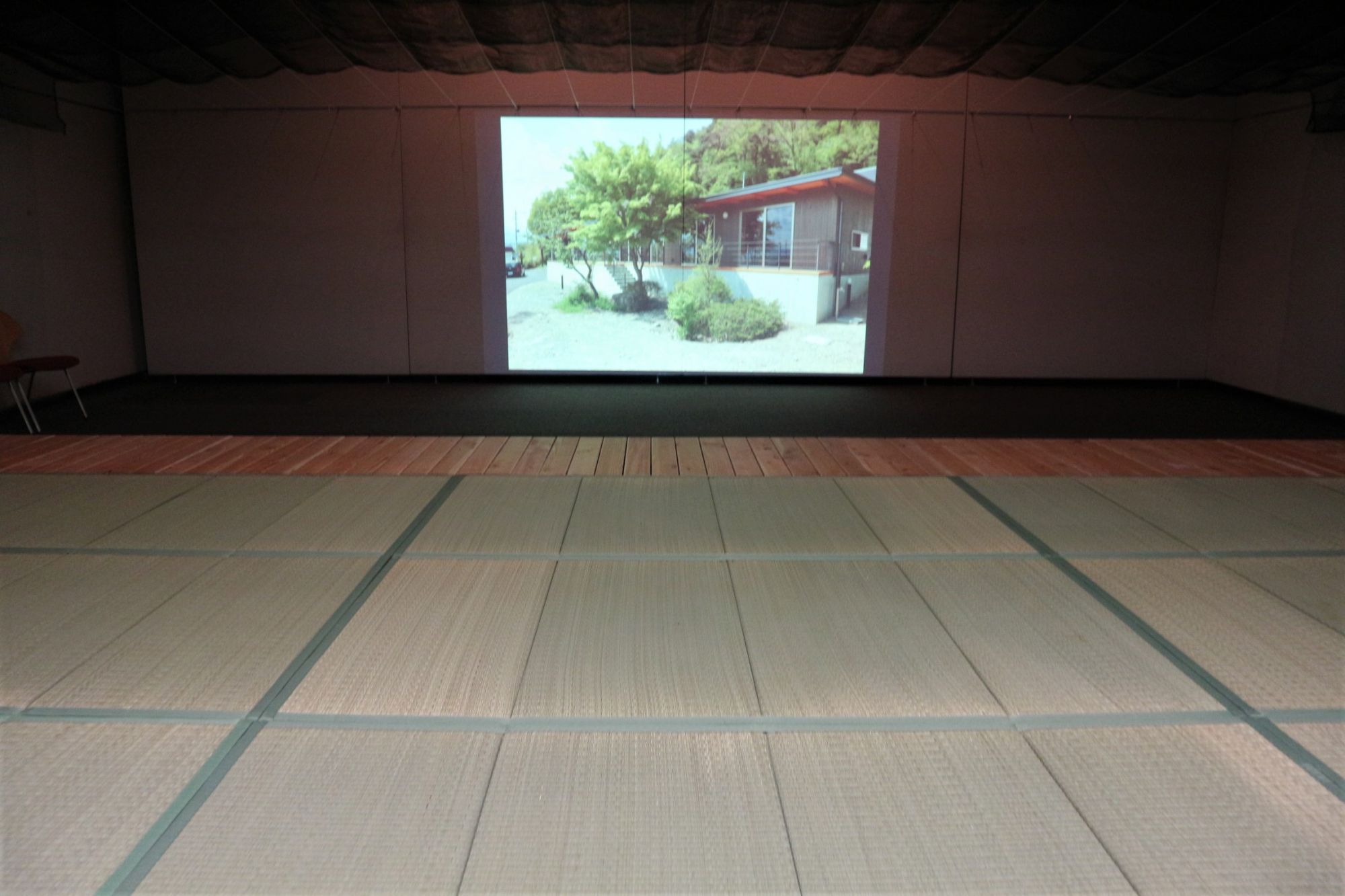 展示室の中に大きな縁台・奥には畳が敷かれ天井には、黒い網のようなもので天幕が設えてあります。