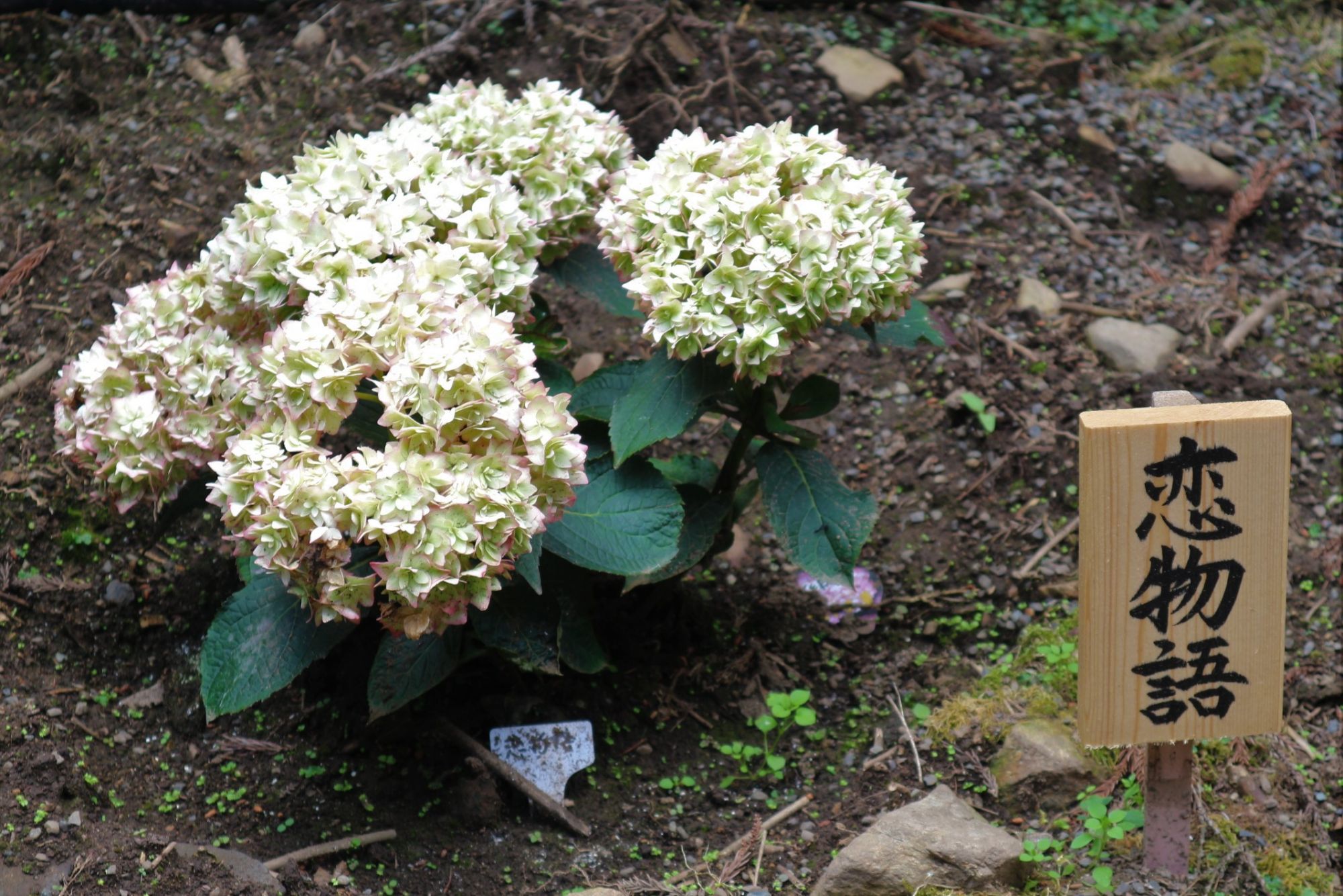 すべての品種の紫陽花に立て札がついていて、名前と花を比べるのも楽しいです。この花は「ウェディングブーケ」名前通り華やかなで初々しさを感じる素敵な紫陽花と名前です。
