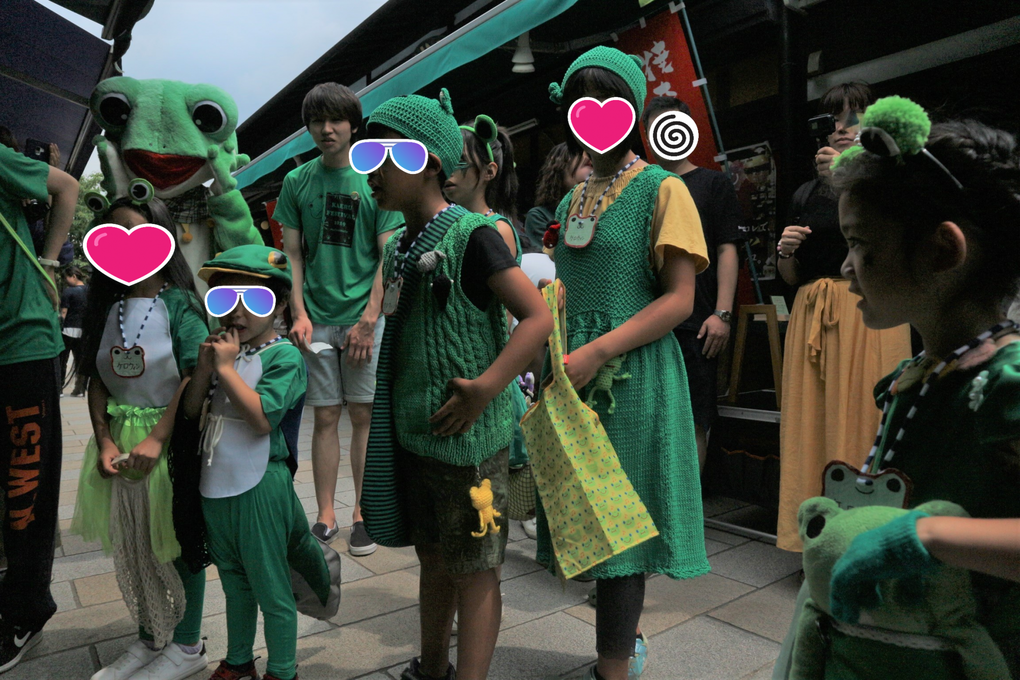 ケロウィン 子供たちがカエルの仮装をして商店街を歩きます。