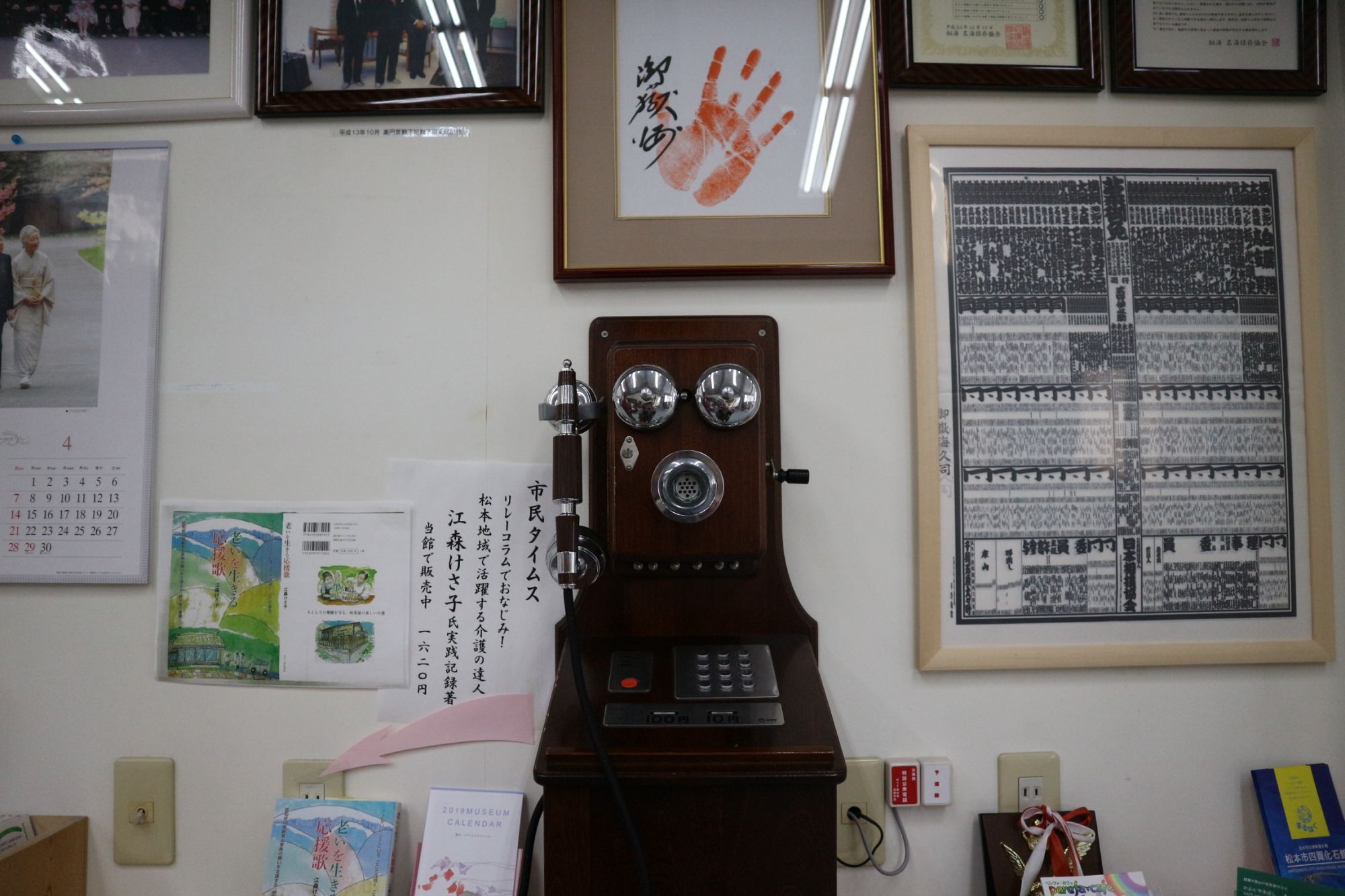 アンティークな公衆電話の上には、御嶽海の手形サイン
