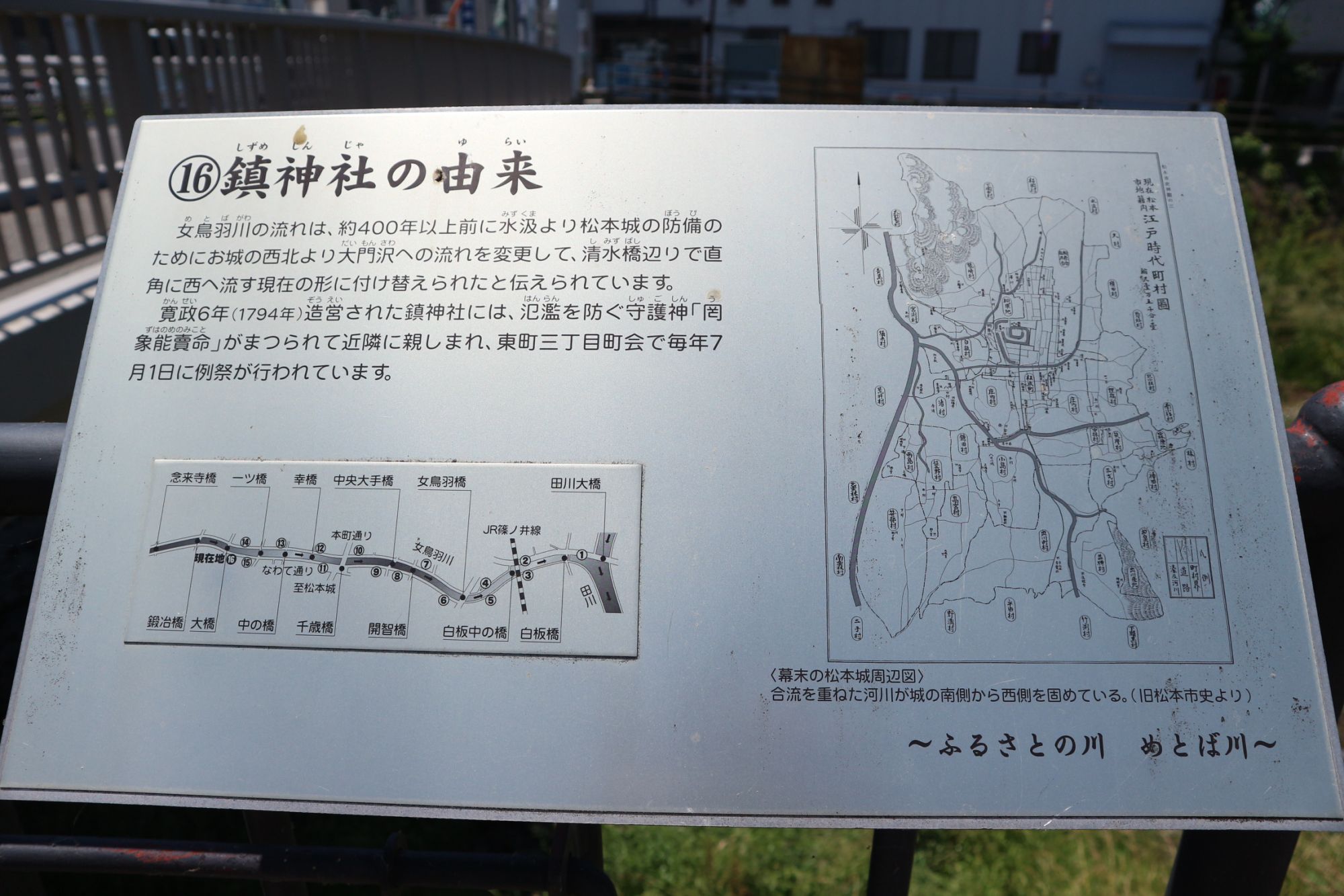 女鳥羽川沿いに「鎮神社」があり、かつて川が頻繁に氾濫した際に祠を祀った神社です。