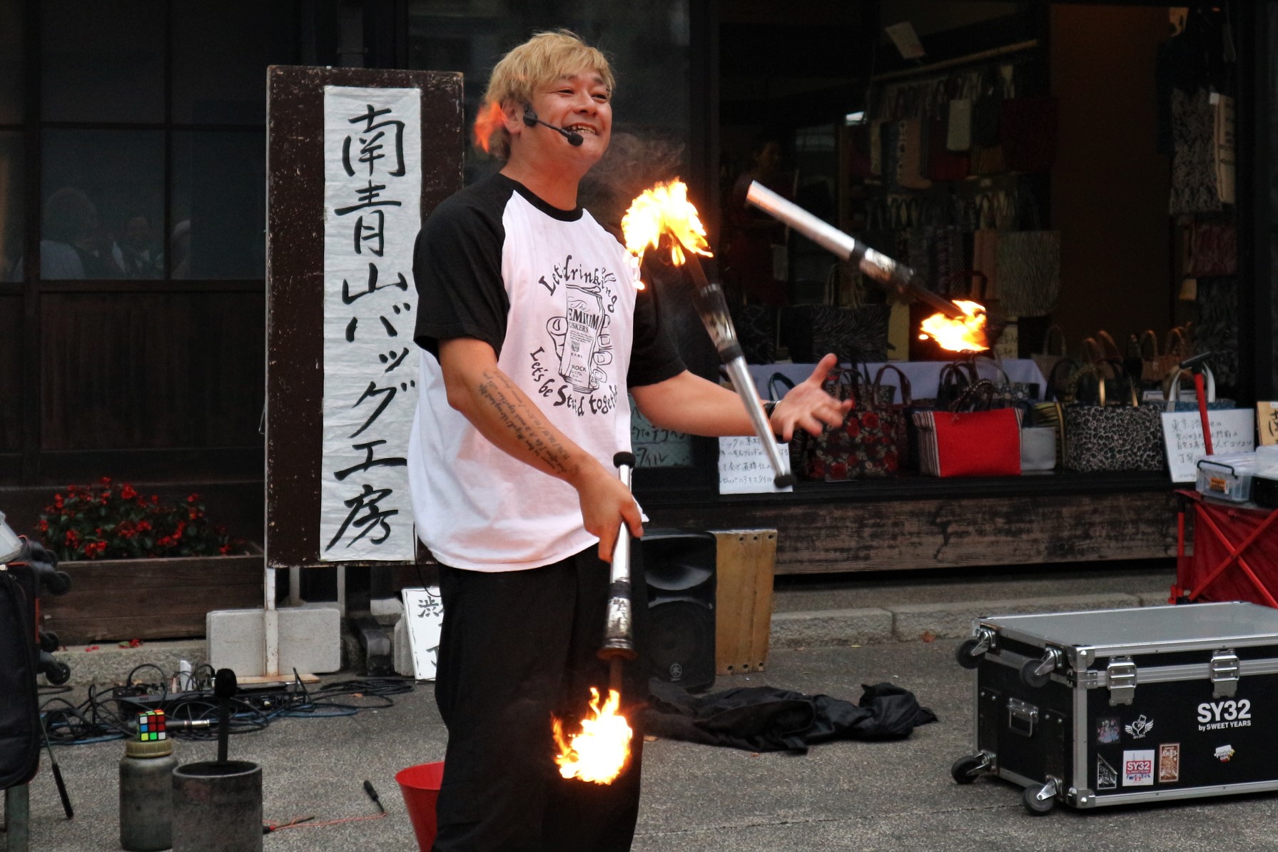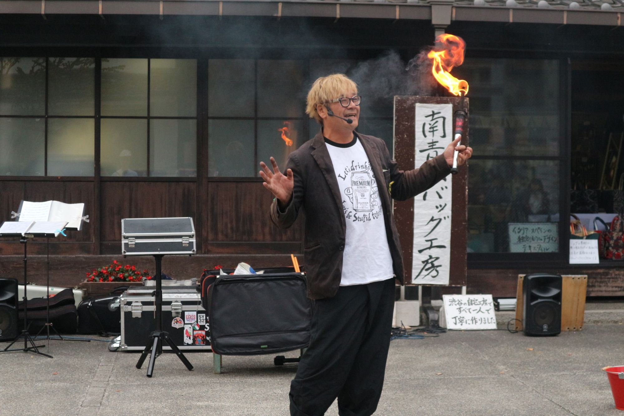 軽快なトークで観る者を魅了するのは、トークだけではない。笑いの連続の中でふとすごいマジックを見せてくれたり、最後は炎のジャグリングで〆る。まさに芸人!