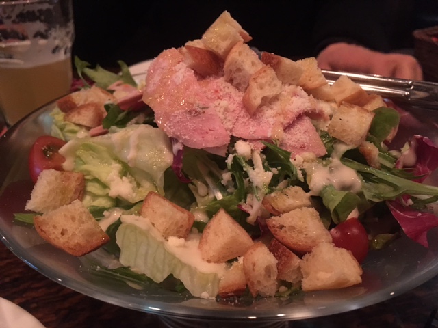 「安曇野放牧豚ハムのシーザースサラダ」ボリュームたっぷりの野菜に散りばめられたハムが嬉しい一品です。