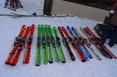 たくさんの試乗用テレマークスキーを用意したようですが、お客さんが予想よりもかなり多かったので、足りなくなりそうな感じでした・・・。今回は、テレマークスキーを履いた事が無い人向けの「体験試乗会」という趣旨なので、スキー板は最新モデルではないのですが、「ブラックダイアモンド」などの良いモデルが並んでいましたね。主催した方々も「自分が試乗してみたいな~」というのが本音だったかもしれません。
