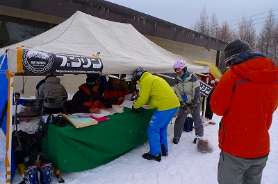 「Mt.乗鞍スキー場」のやまぼうしレストランの横に受付テントが張ってあり、朝9:30から受付を開始しました。当日は、予想に反してたくさんのお客さんが来て、とても盛況のようでした!