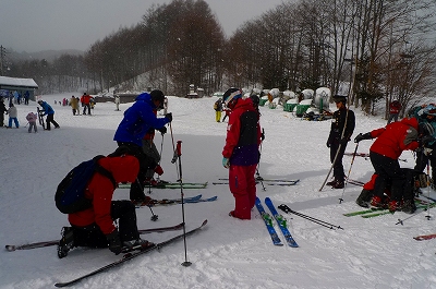試乗したい方は、受付を済ませて、テレマークブーツを履いて、テレマークスキーを付けて、用意をしています。スタッフの方が付き添って、ブーツの履き方から教えてくれました。