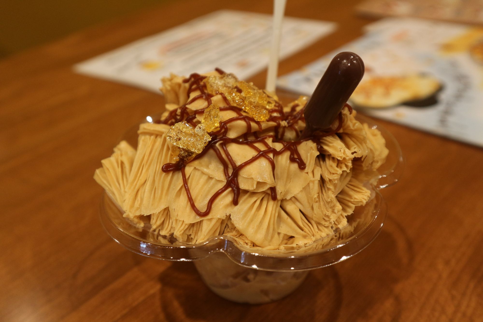 一緒に行った友達から一口プリンかき氷を頂きました。プリンを凍らせたものを薄く削り取り盛り付けています。