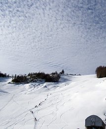上級コースのかもしかゲレンデのリフトの運行はまだですが、新雪を滑る醍醐味を味わいたい方々が自力で登って行くのが見えました。この日はおおむね晴天でしたが、この時は空に一面にうろこ雲が出て面白い光景でした。