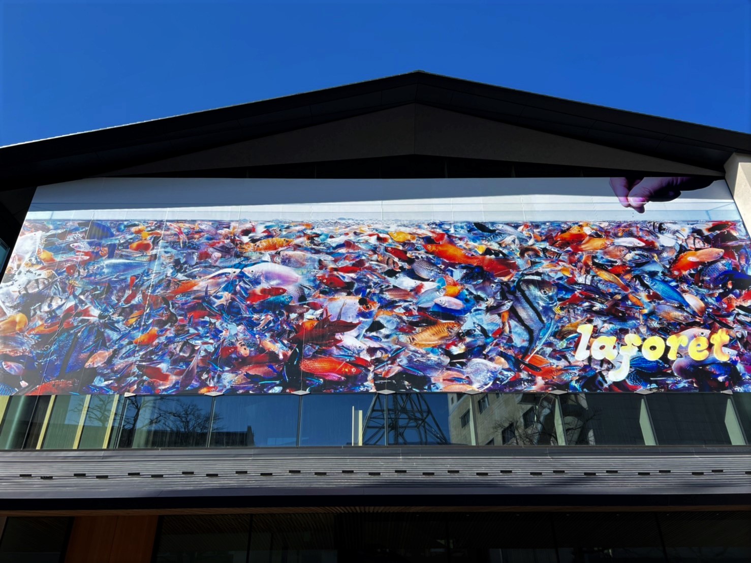 沢山の熱帯魚がモチーフとなっている写真で、通りを歩いていて見上げたらビックリするような迫力ある作品です。