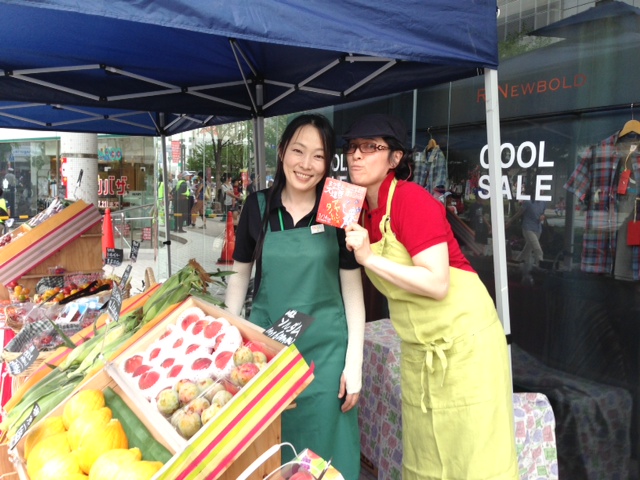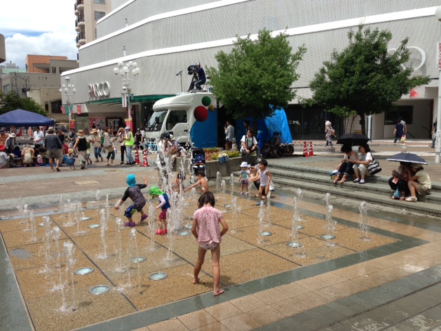 夏の暑さを物ともしない子供達。 炎天下でも水と子供達はベストマッチング!どの子も大騒ぎしながら、水と戯れていました。 パルコ北側の歩道では、健康的なビタミンレディが栄養たっぷりな野菜・果物を販売していました。
