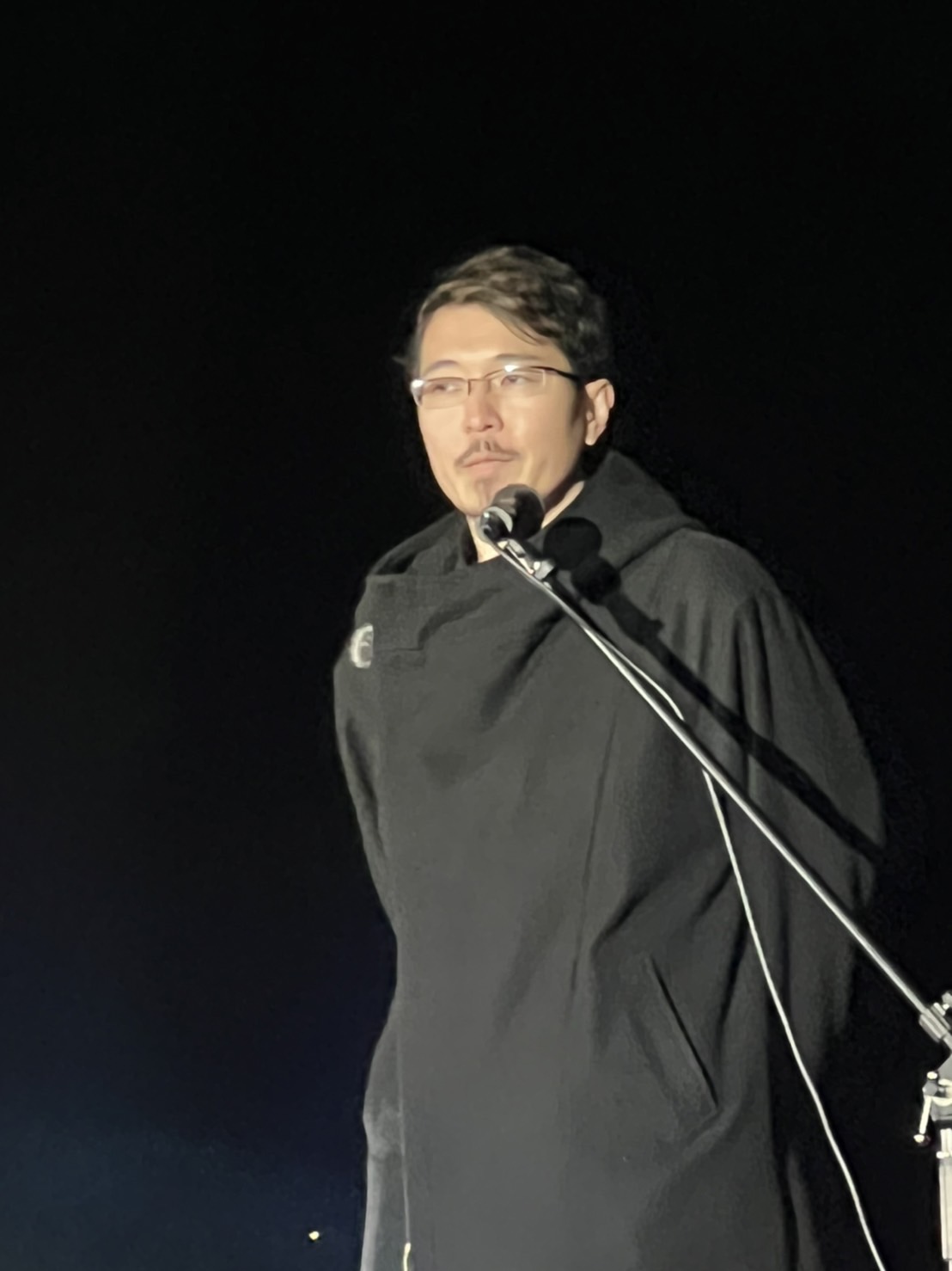 松本市長、松本市議会議長芝山さんの二人からは、開催のご挨拶、イルミネーションを担当したデザイナーさんからイルミネーションの説明を伺いました。