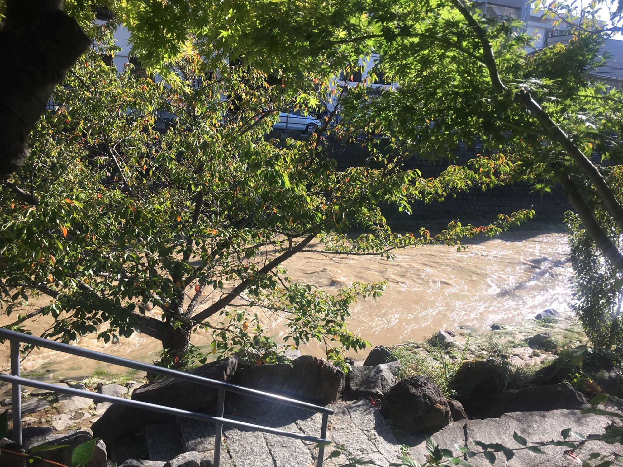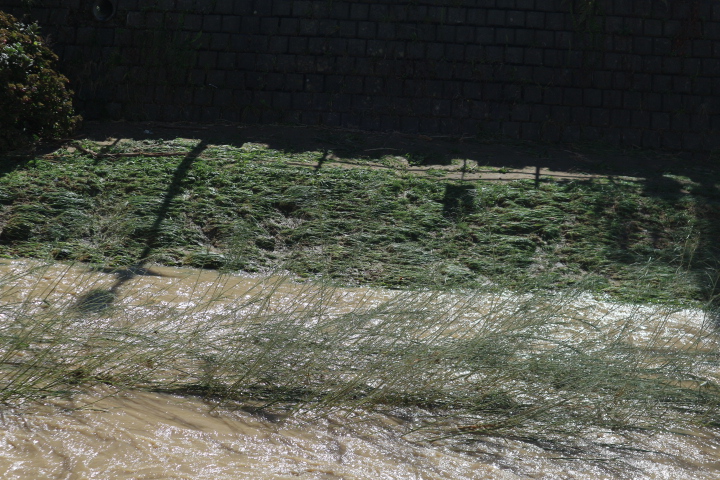 女鳥羽川も徐々に水が引き始めていましたが、茶色く濁った濁流が終日流れていました。