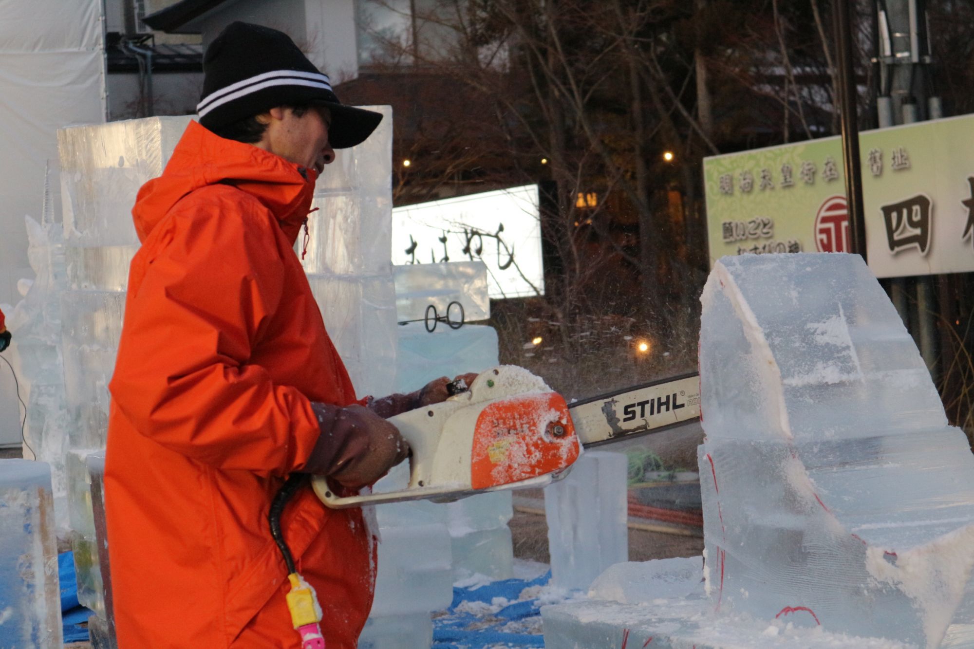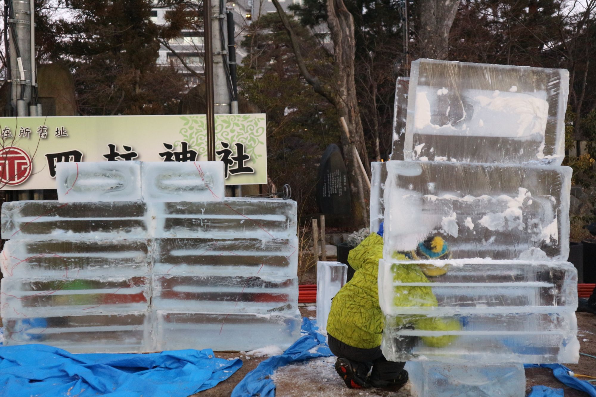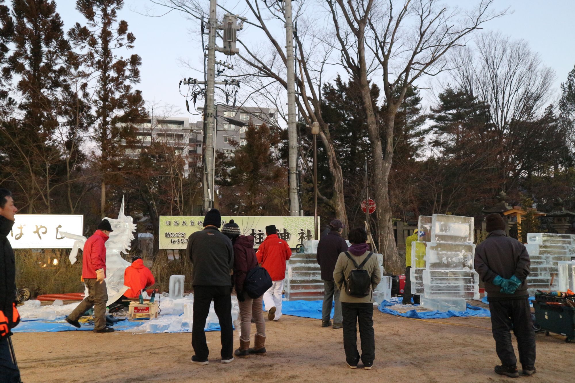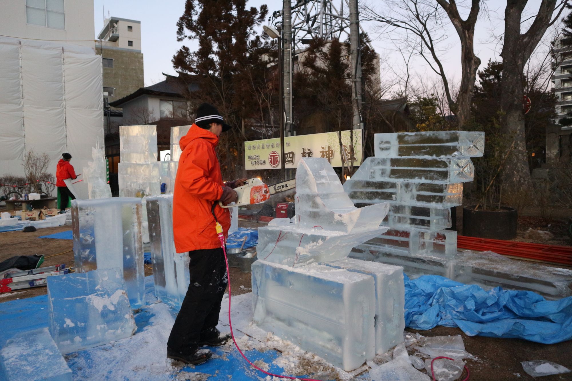 3組の方が2月1日の朝まで氷彫制作を行います。展示は2日14時までです。