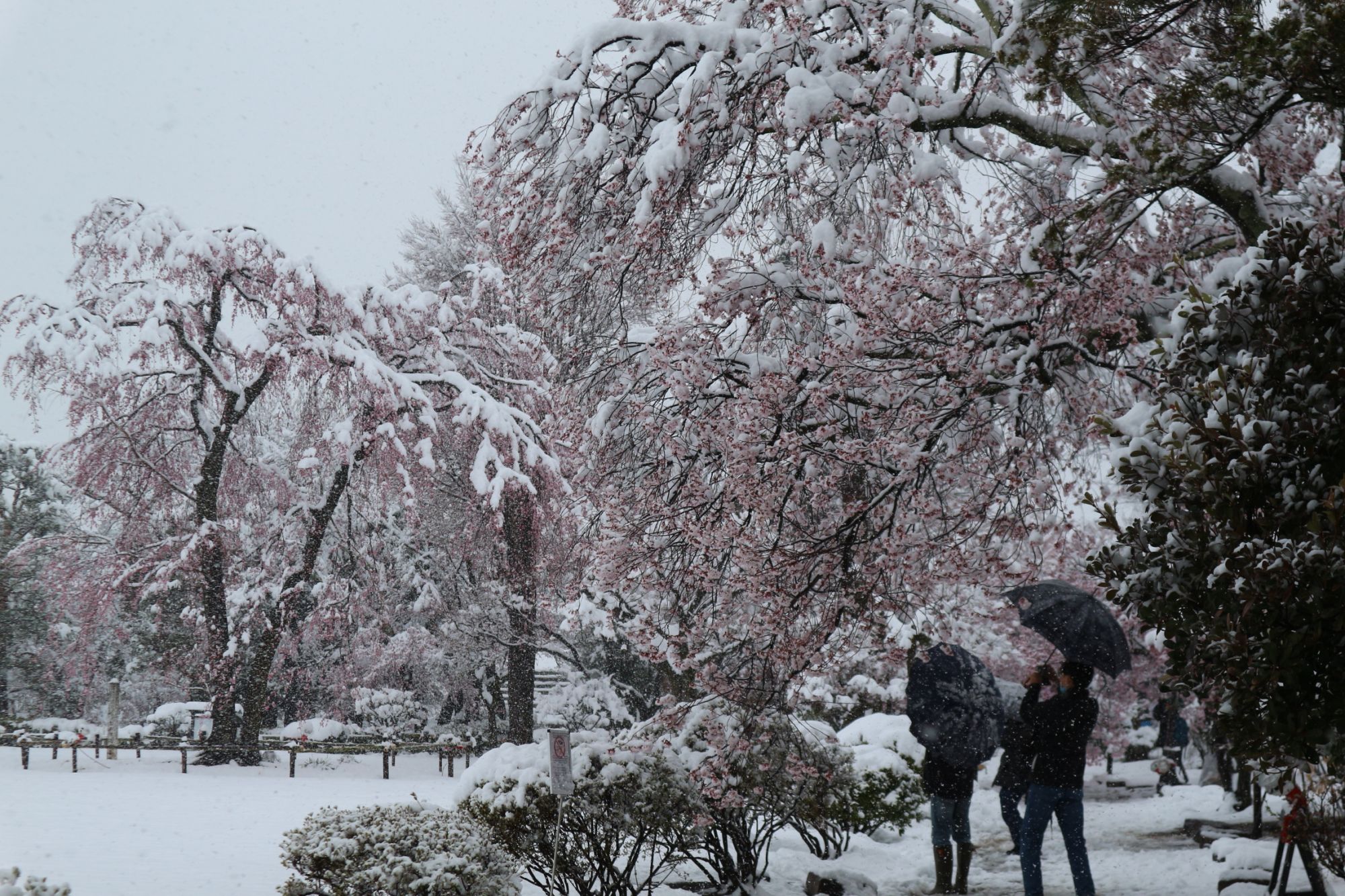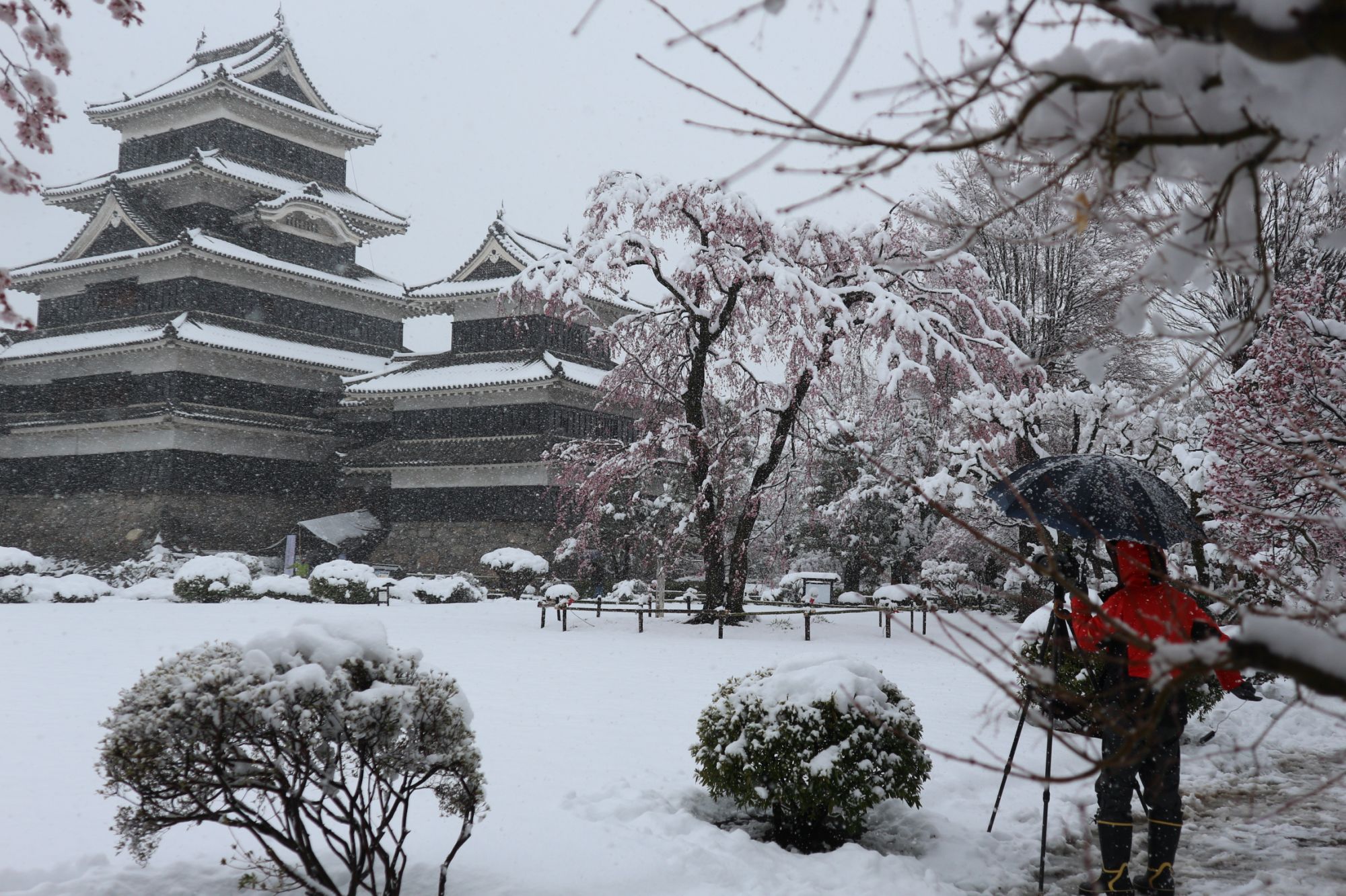 国宝松本城 春の雪と桜