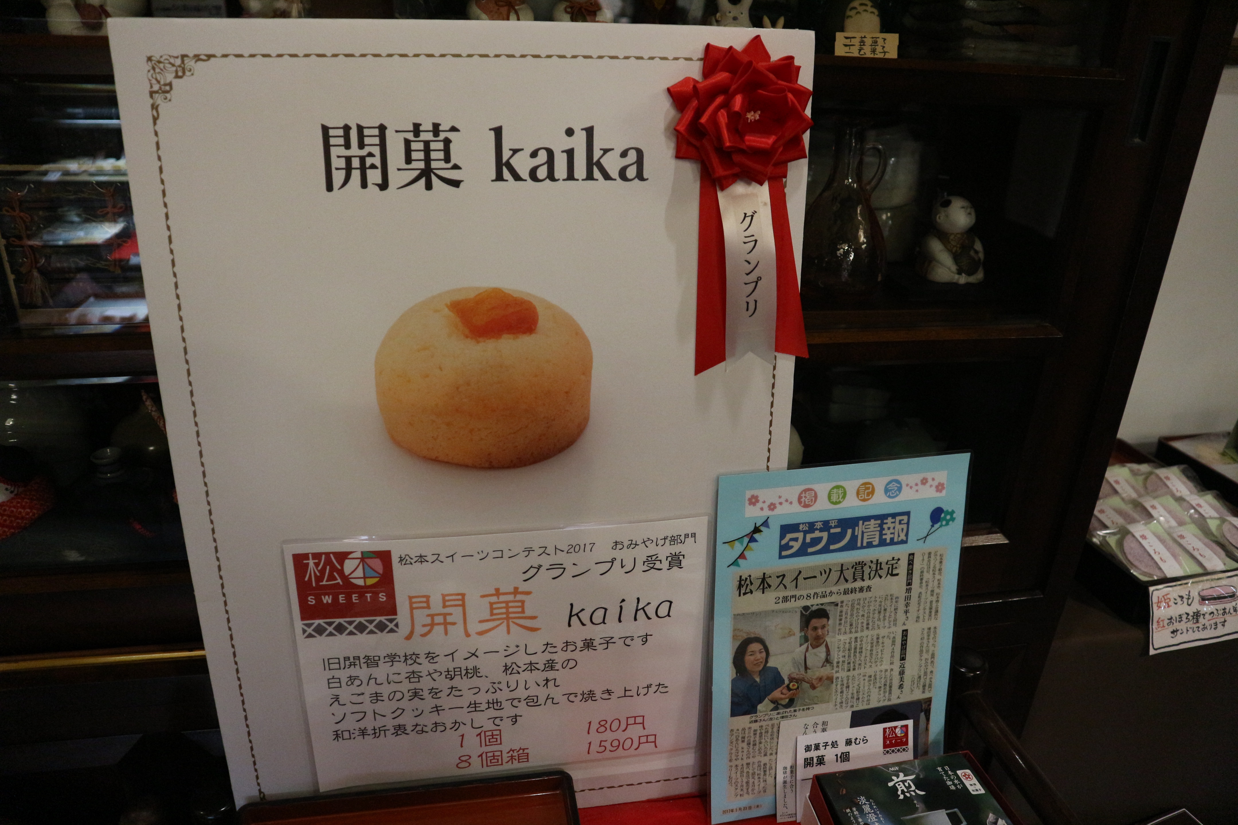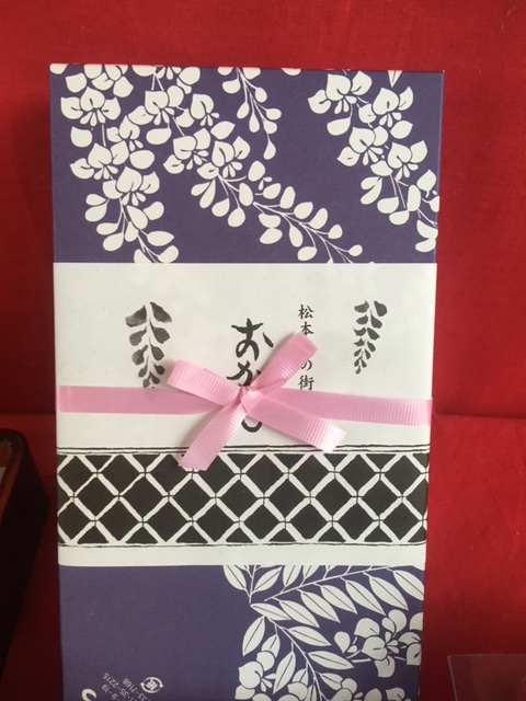 旧開智学校をイメージしたお菓子です。白あんこに杏や胡麻、松本産のえごまの実をたっぷりいれソフトクッキー生地で包んで焼きあげた和洋折衷なお菓子です。・・・と札に書いてあります(*^_^*)