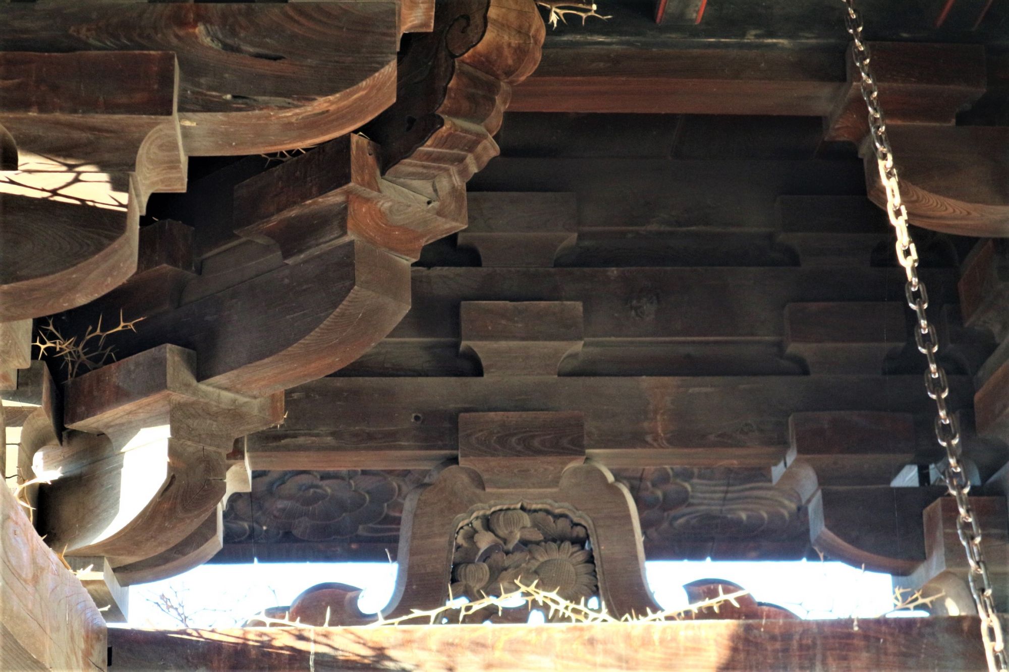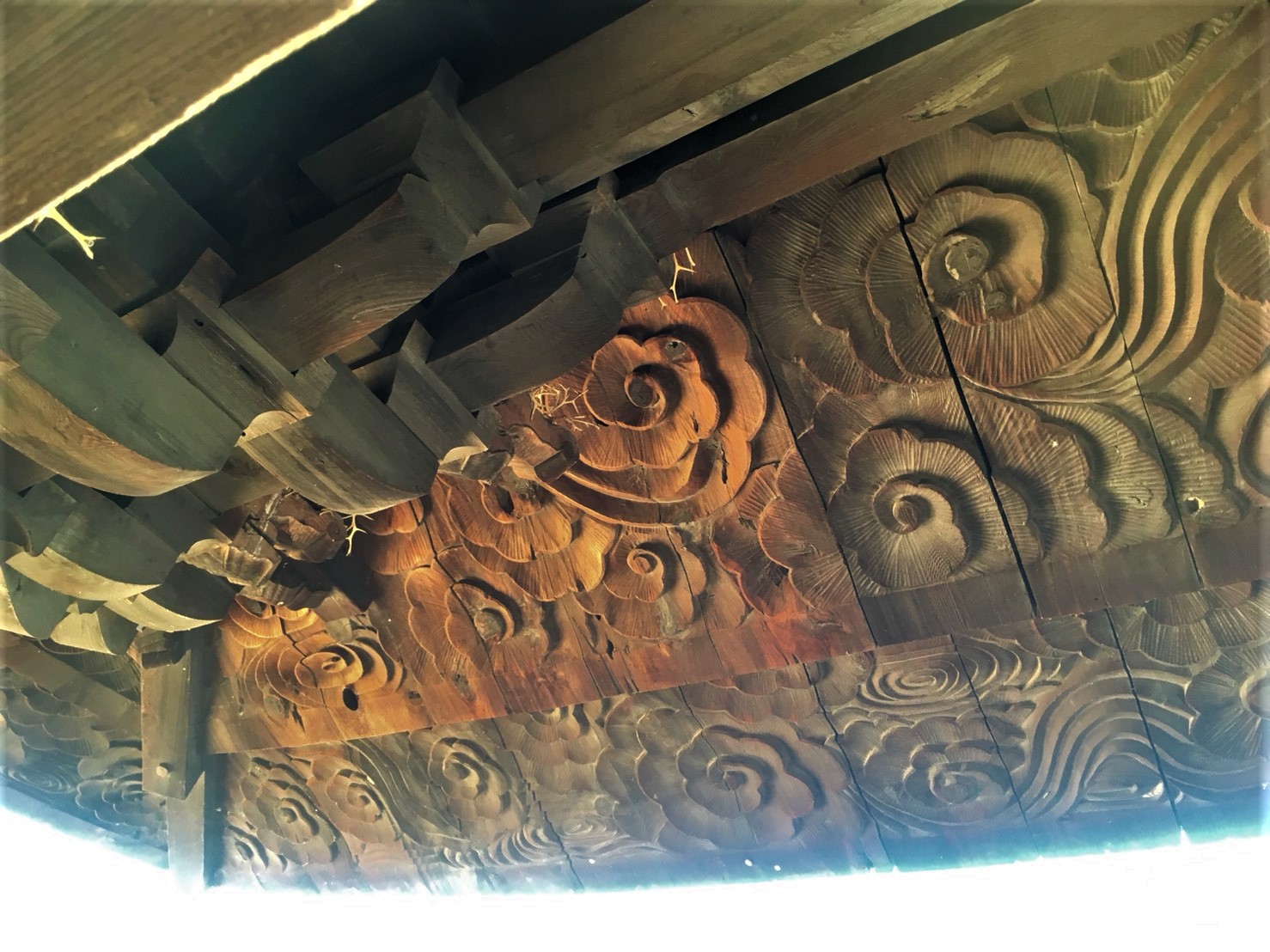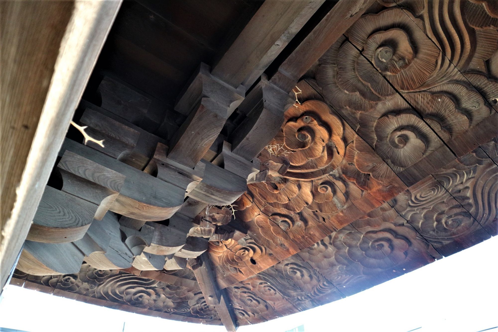 鐘楼の屋根の裏には、彫りものがあり、渦巻き模様から波打つような水模様で火災などおきないためのおまじない的な意味もあります。