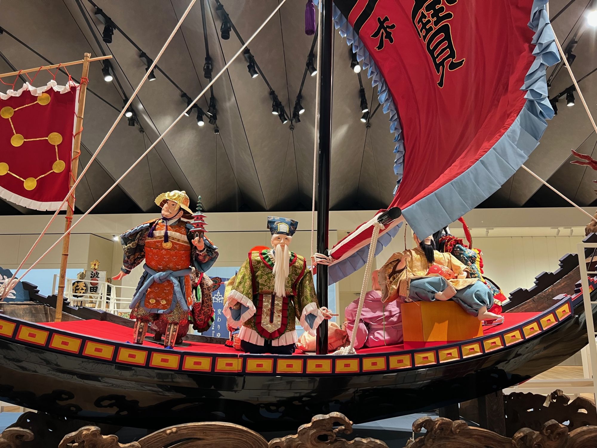 にぎわう商都では、城下町ジオラマに並ぶ目玉の展示「宝船」があります。