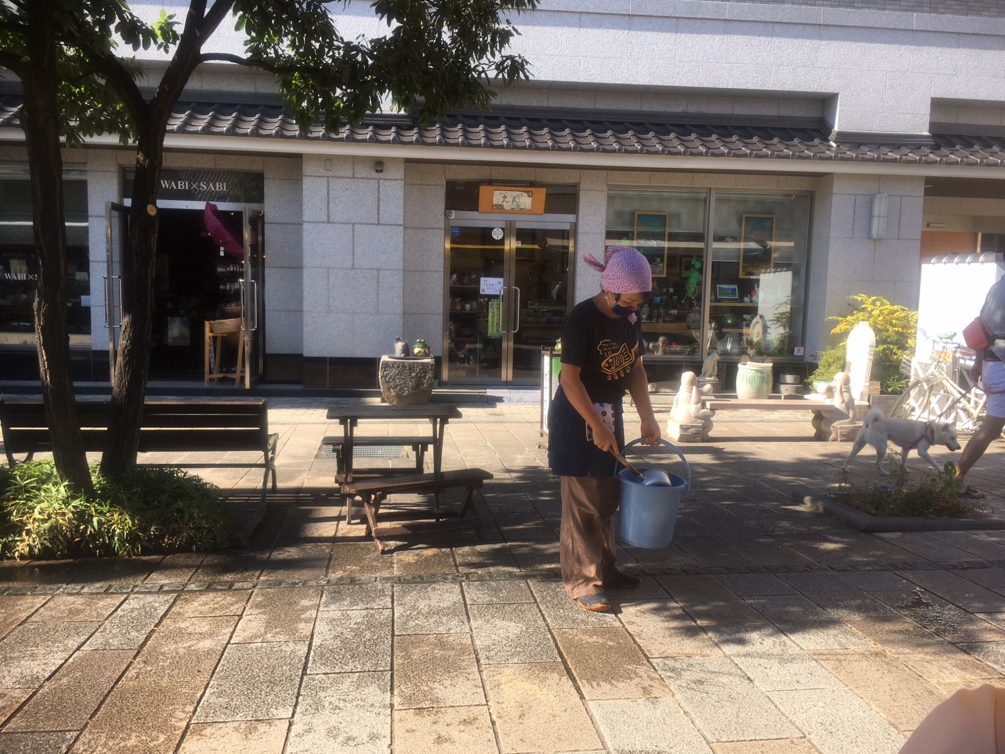 あまりの暑さに打ち水大作戦していました。