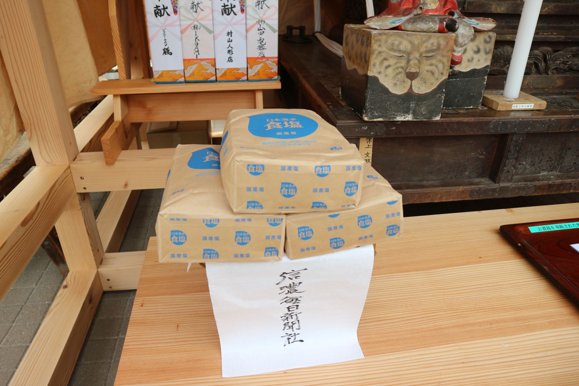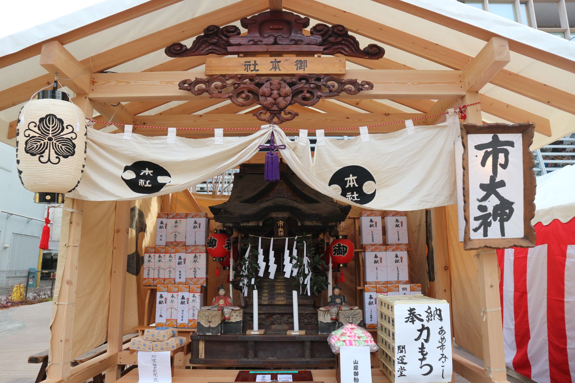 信毎メディアガーデンの前庭に本町二丁目の市神様をお迎えする拝殿が供えられています。
